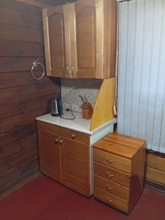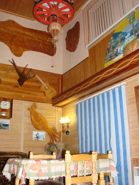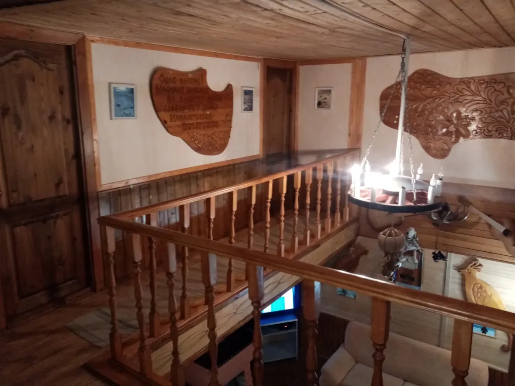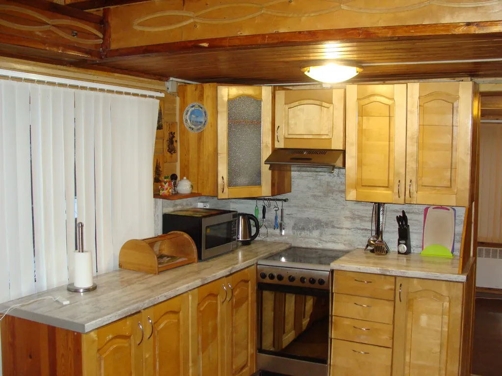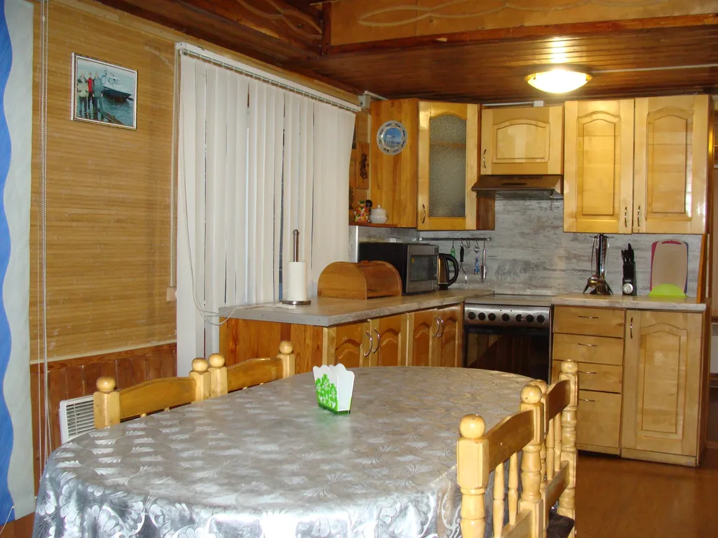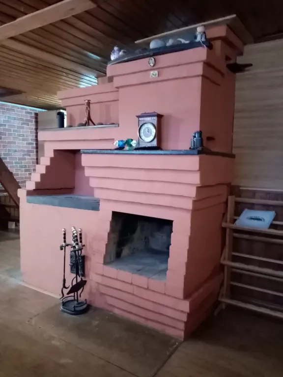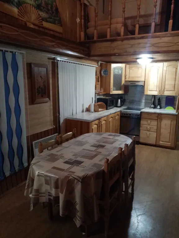 На первом этаже общая кухня-столовая 28 кв. м, печь «шведка», камин, оборудованная кухня с посудой, диван, кресло, обеденный стол, эл. плита, микроволновая печь.