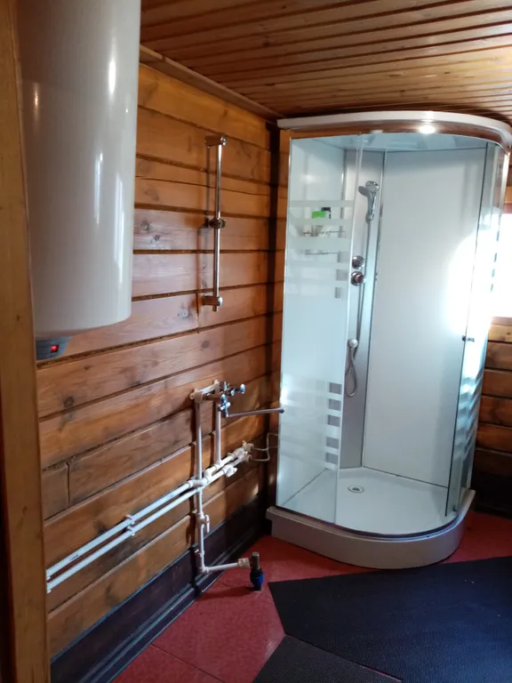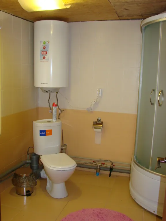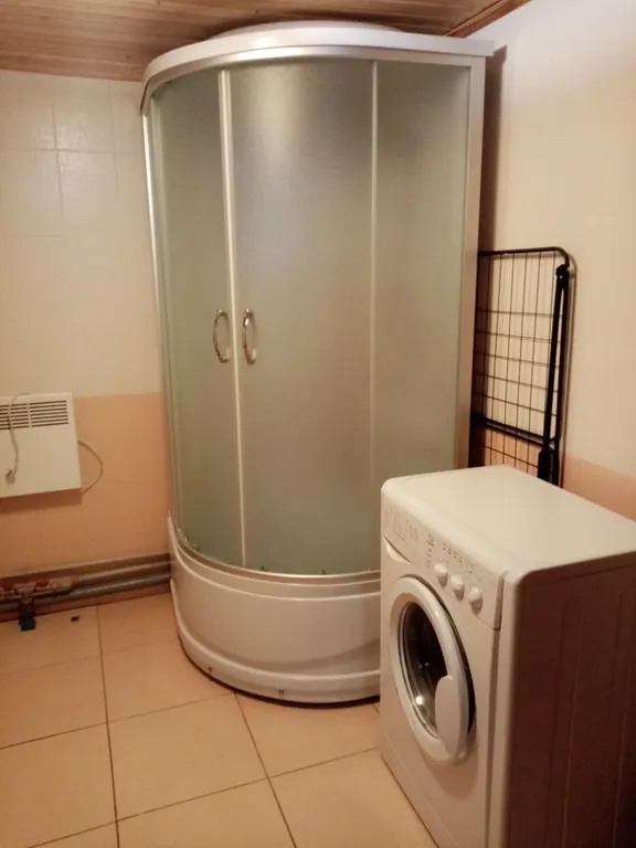 Туалет с душевой кабинкой также расположен на первом этаже, в санузле тёплый пол, бойлер на 100 литров, стиральная машина, вода из артезианской скважины 90 м.