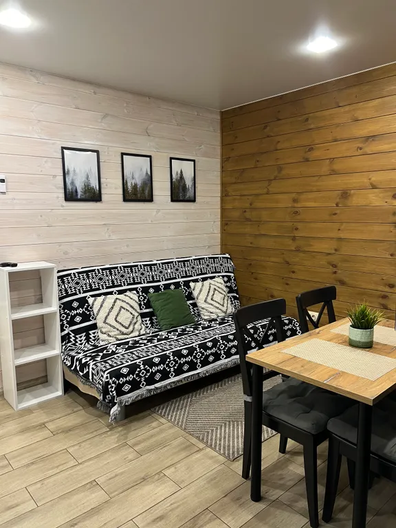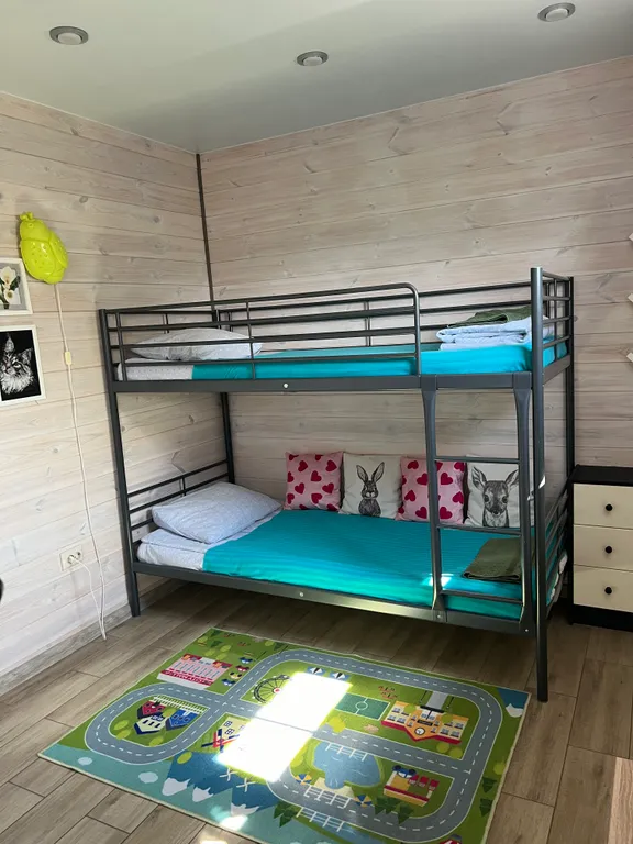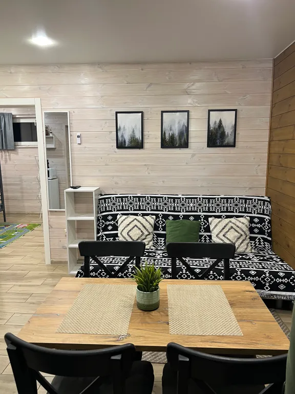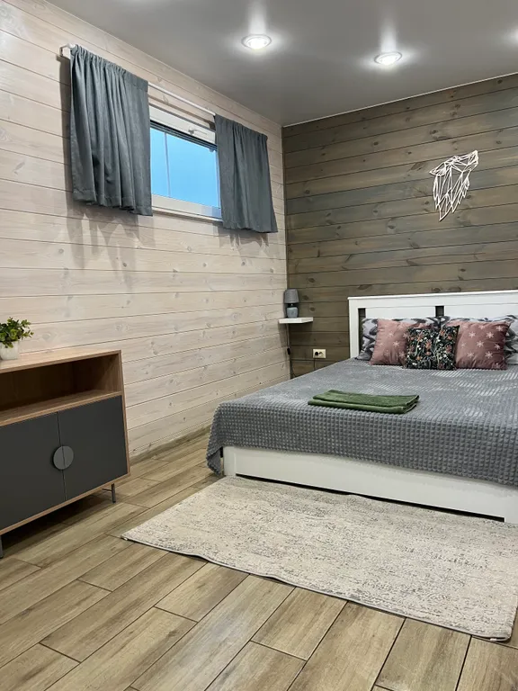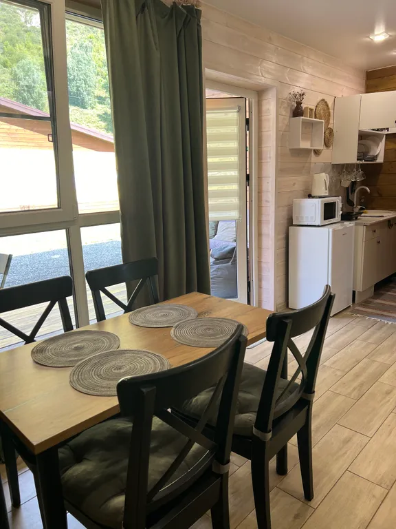 Данный дом размещает комфортно до 5 человек. В доме отдельная спальня с двухспальной и двухъярусной кроватями и кухня-студия с двухспальным диваном.