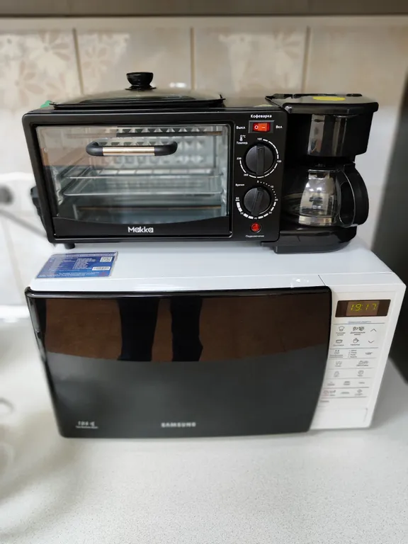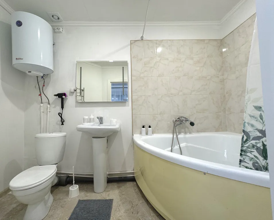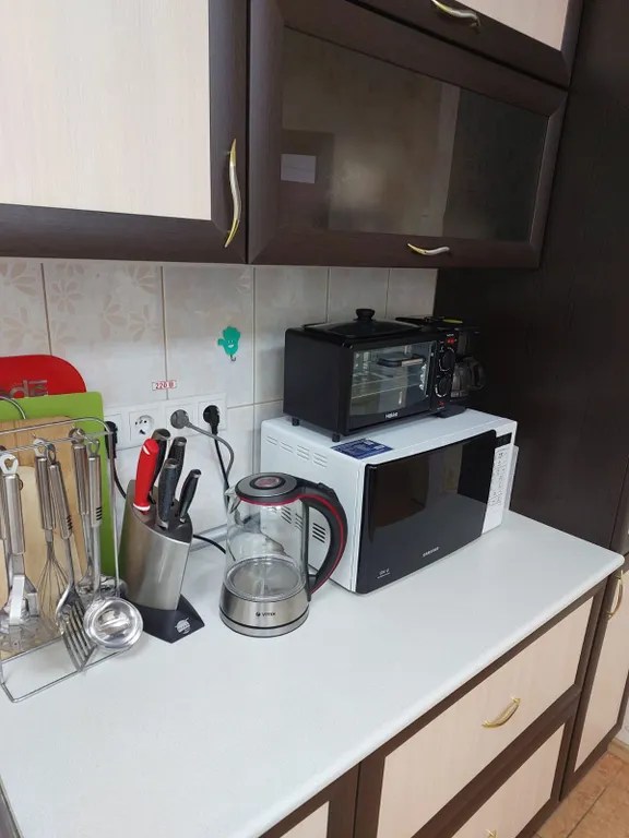 Современная мебель, а также техника: холодильник, микроволновая печь, электрочайник, посуда, кондиционер, фен, полотенцесушитель и водонагреватель