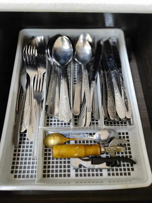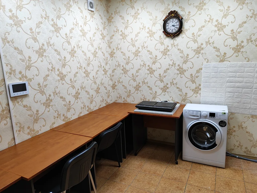 Отдельная кухня: электроплита, холодильник, стиральная машина, микроволновая печь, чайник, кулер с водой, посуда (столовая, для приготовления пищи), утюг, гладильная доска