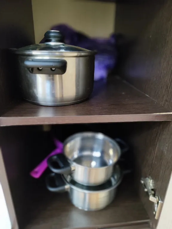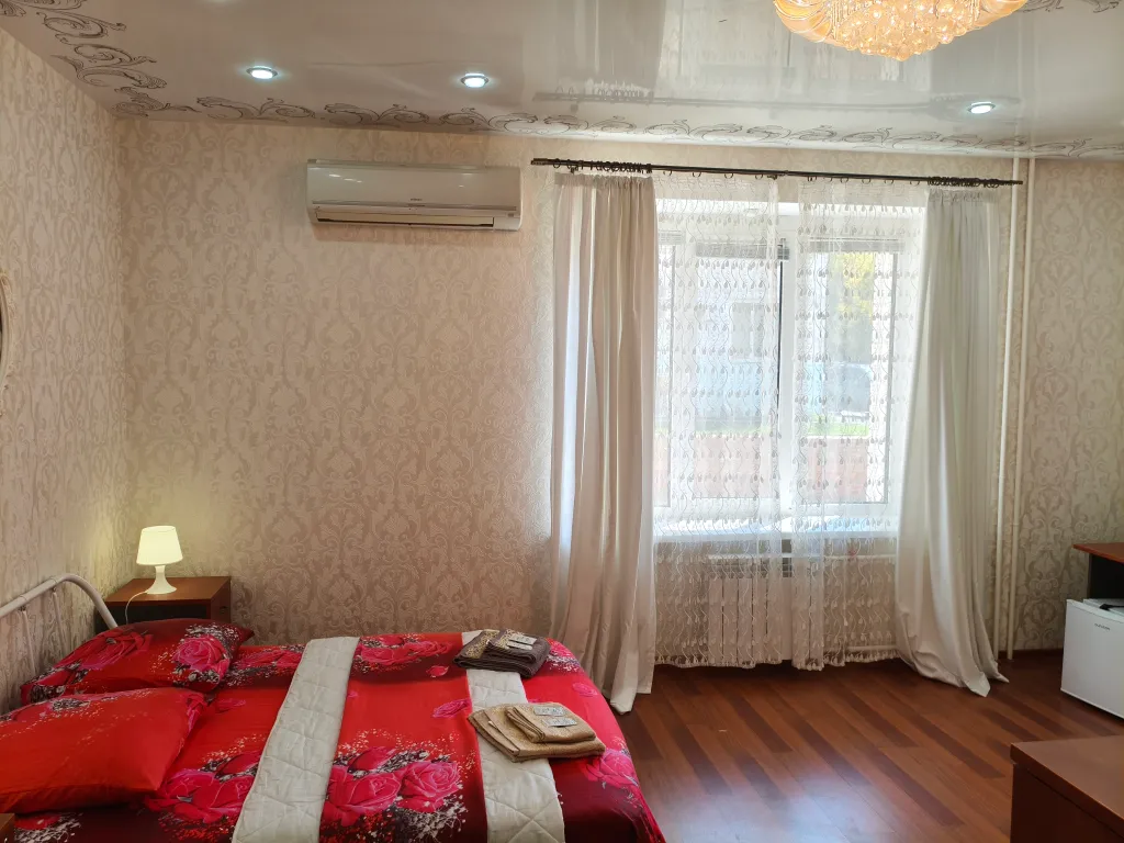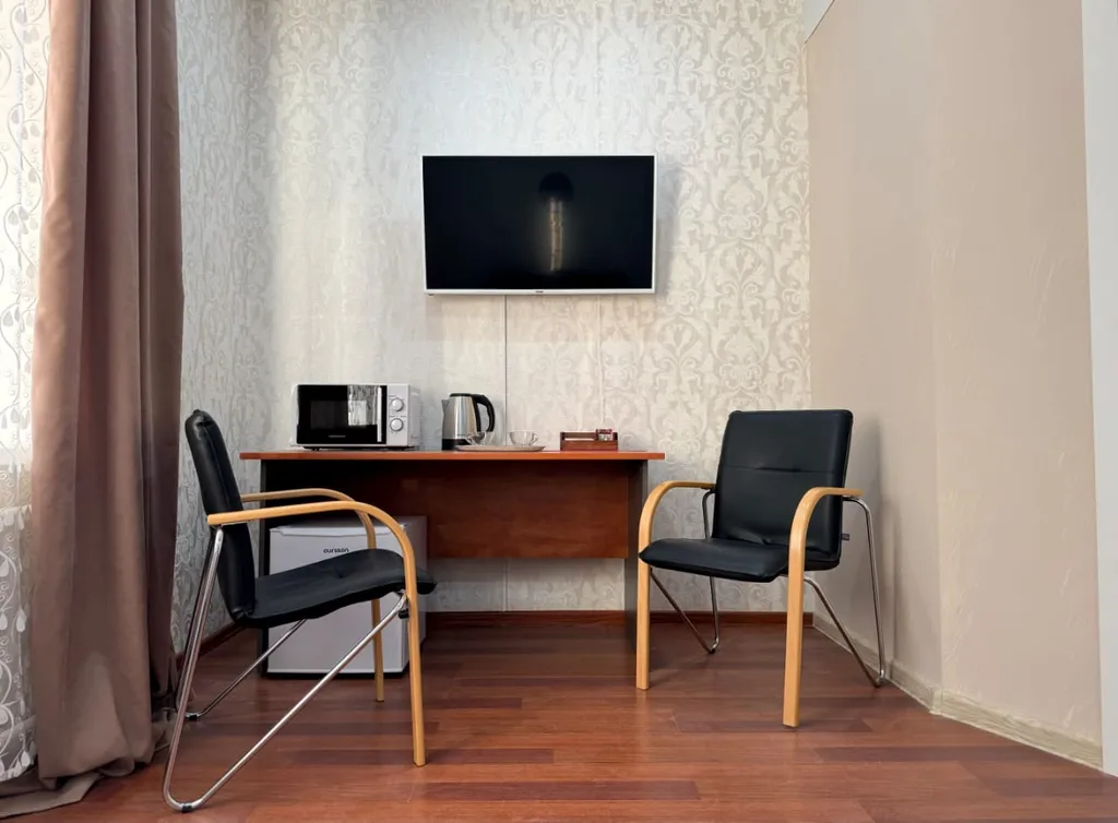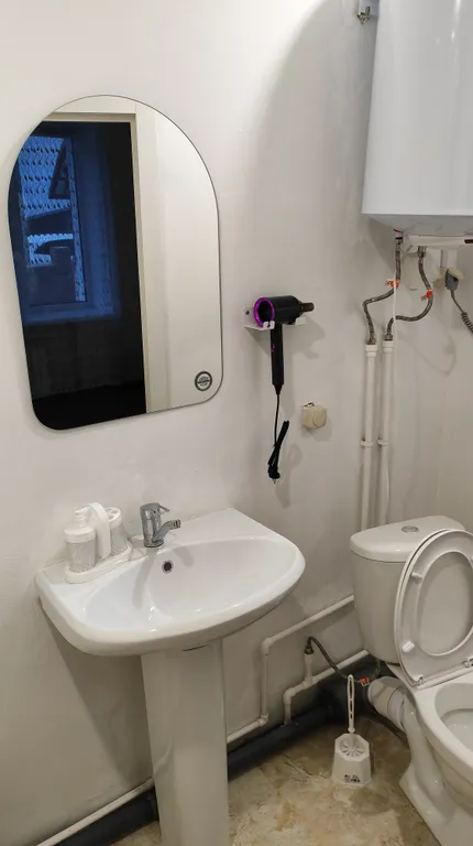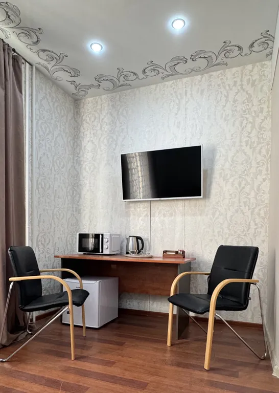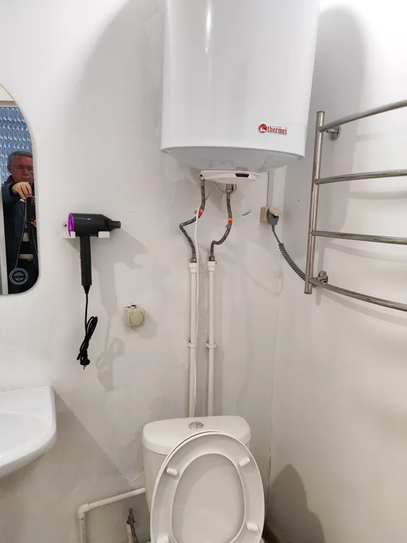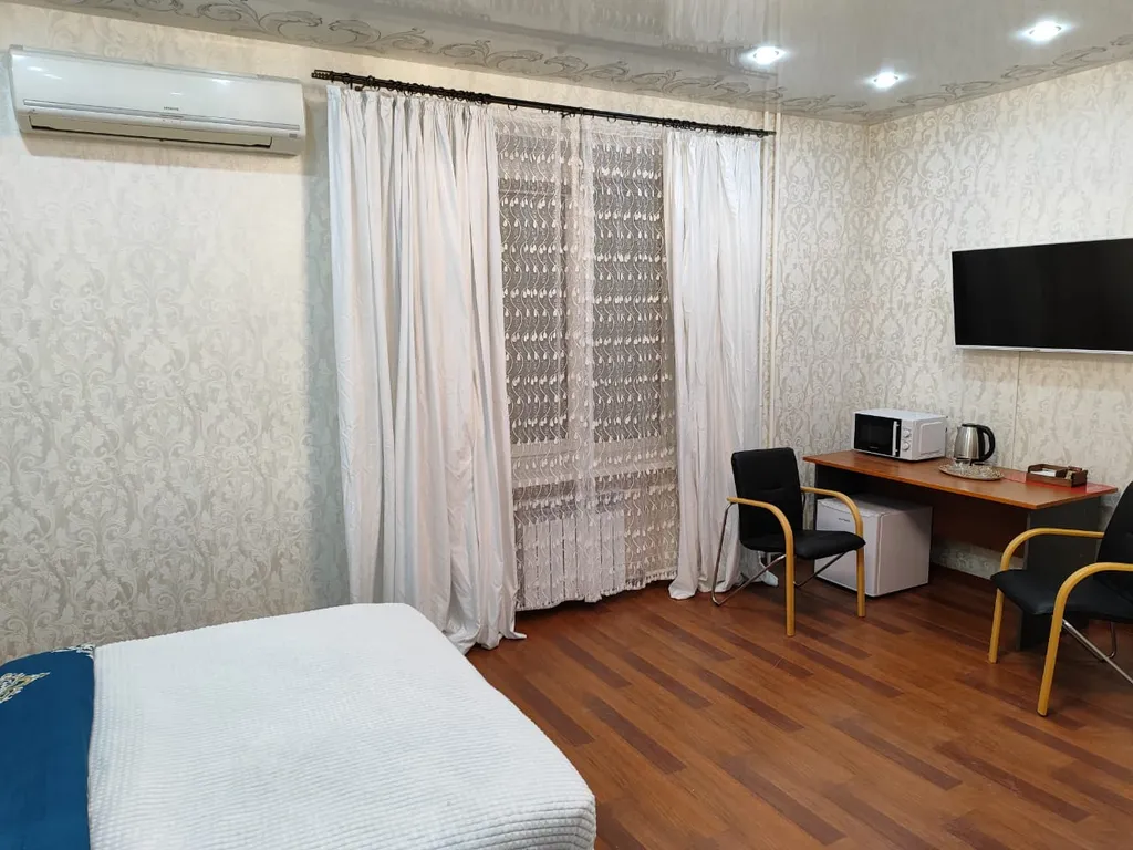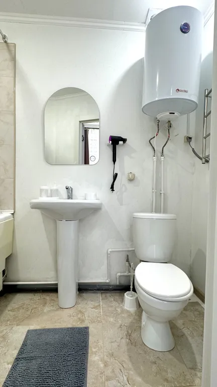 Современная мебель, а также техника: холодильник, микроволновая печь, электрочайник, посуда, кондиционер, фен, полотенцесушитель и водонагреватель