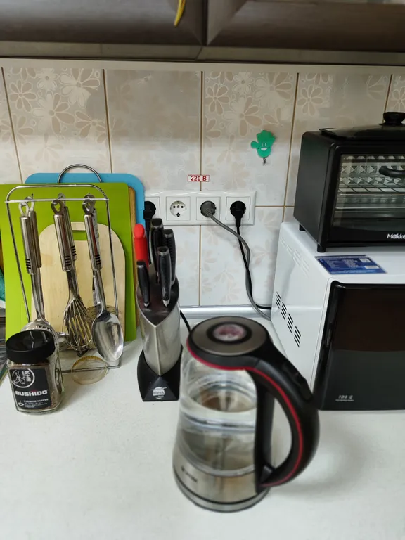 Отдельная кухня: электроплита, холодильник, стиральная машина, микроволновая печь, чайник, кулер с водой, посуда (столовая, для приготовления пищи), утюг, гладильная доска