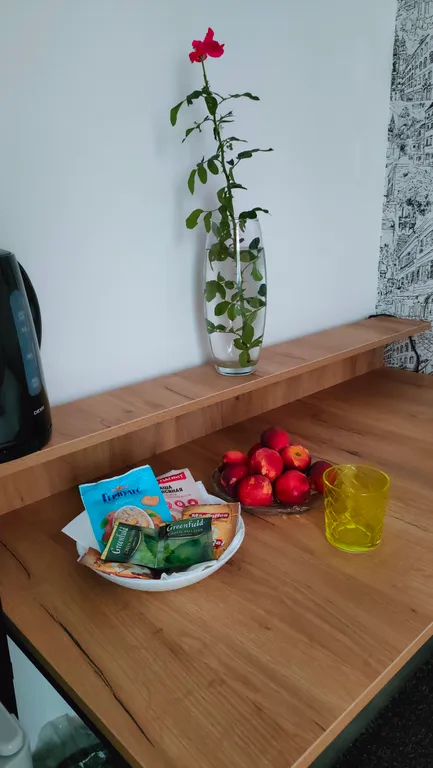 — приветственный набор (кофе, зелёный чай, овсянка, сахар, вода), позволяющий приготовить себе диетический завтрак;