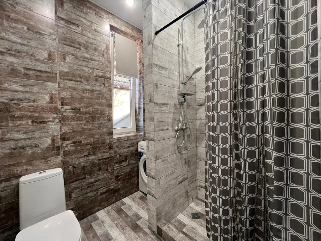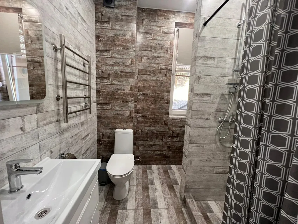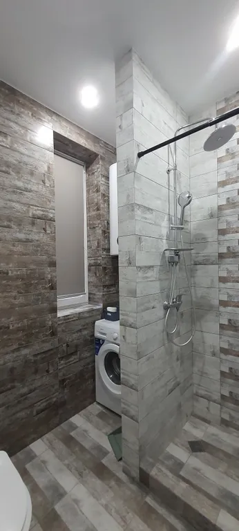 Современная ванная комната станет вашим личным спа-салоном. Душевая кабина с тропическим душем, стильный полотенцесушитель и качественные сантехнические аксессуары обеспечат максимальный комфорт и релаксацию. Геометрический узор на плитке добавляет интерьеру элегантности и утонченности, а большое зеркало и мягкие полотенца создают ощущение домашнего уюта.