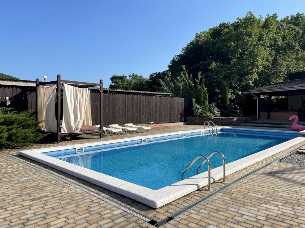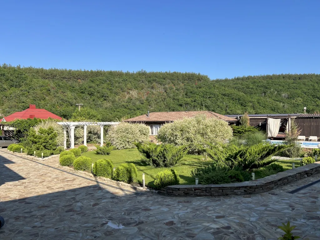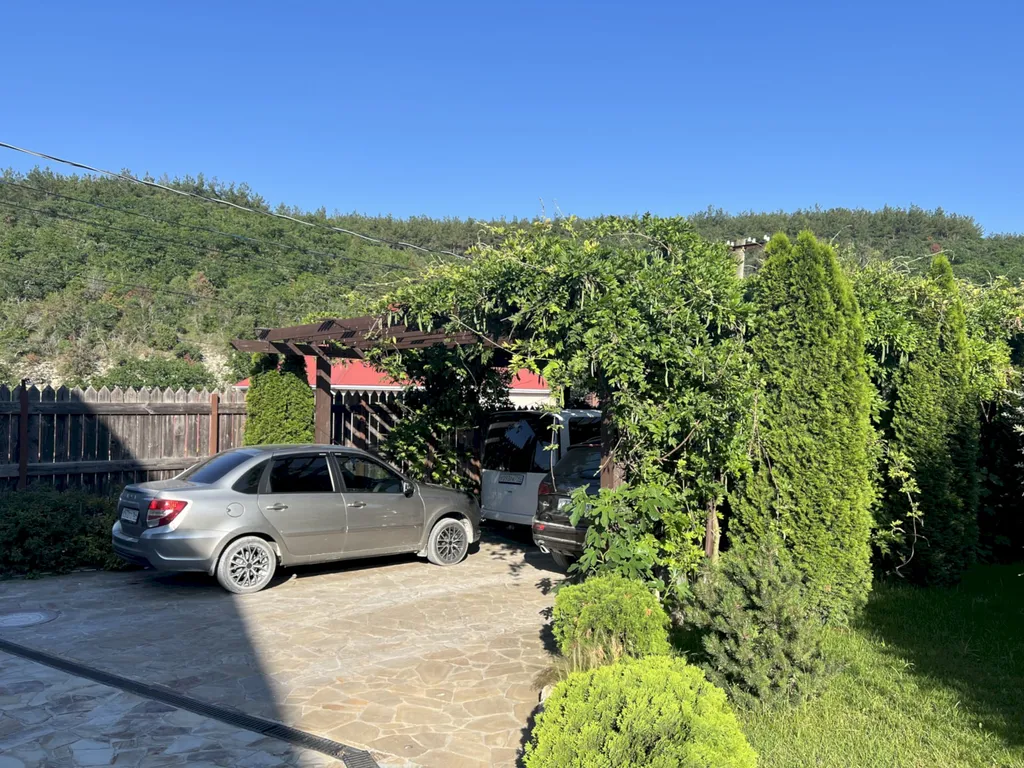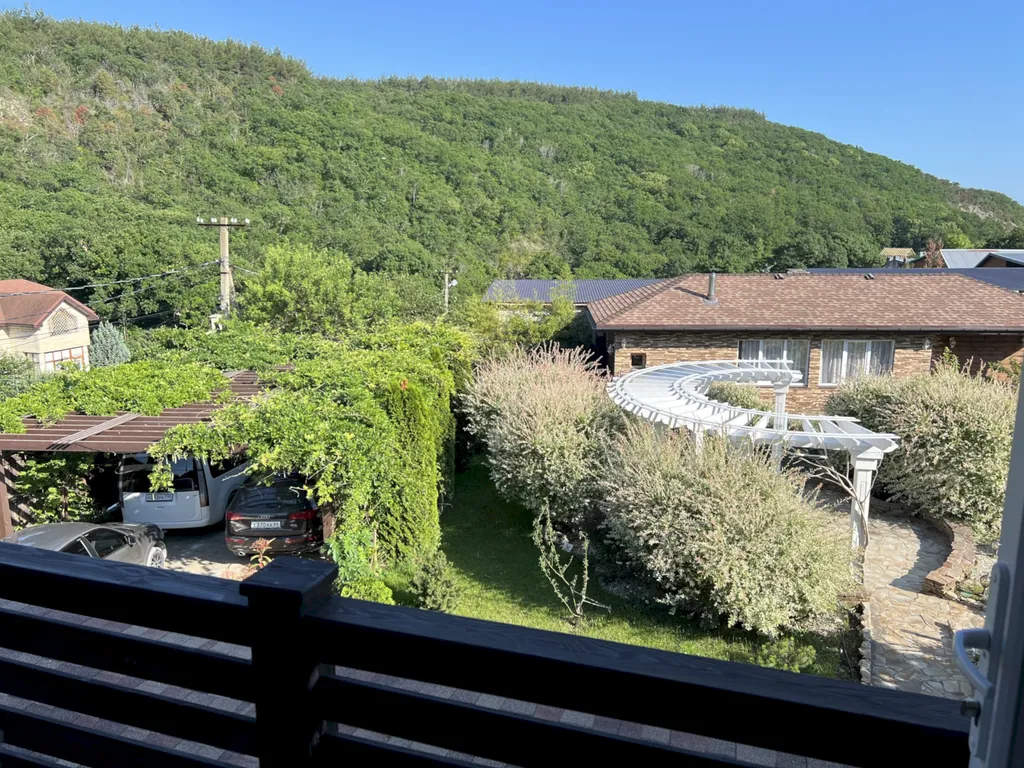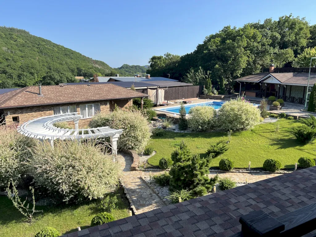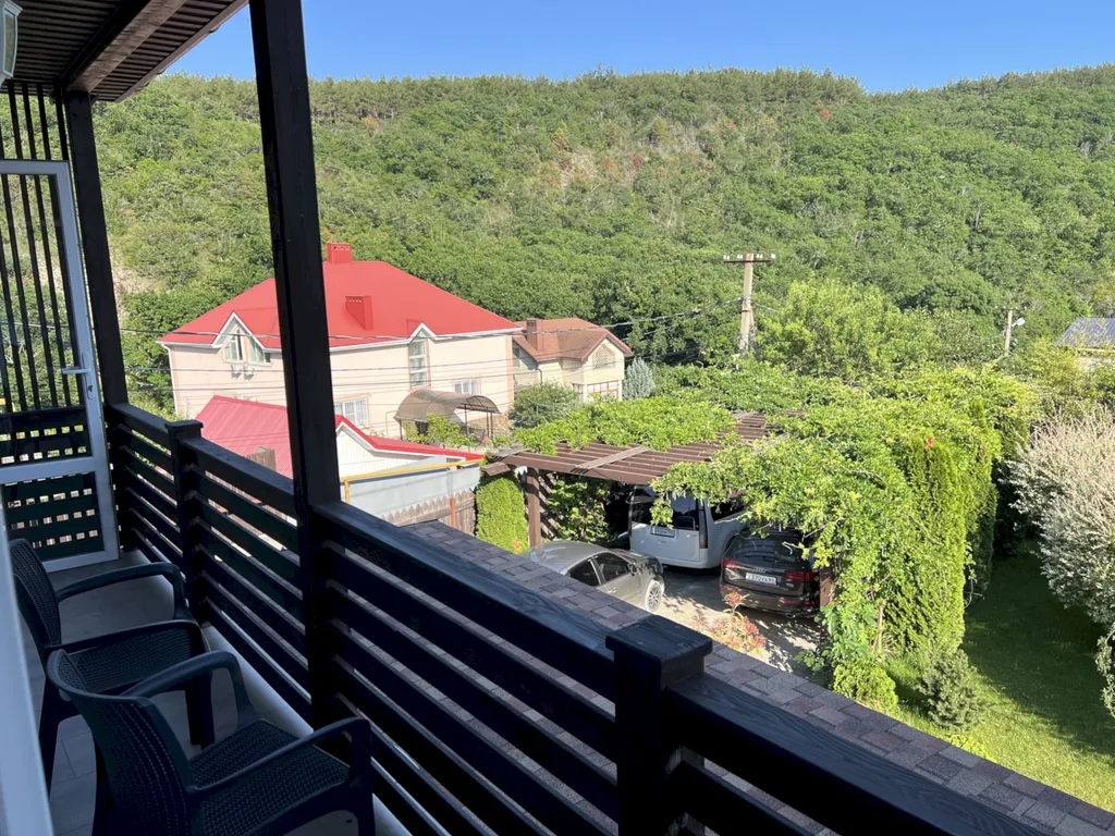 Двухэтажный таунхаус в лесном массиве, вид на горы, терраса, бассейн, шезлонги, зелёный двор, парковка, баня на дровах, необходимая техника