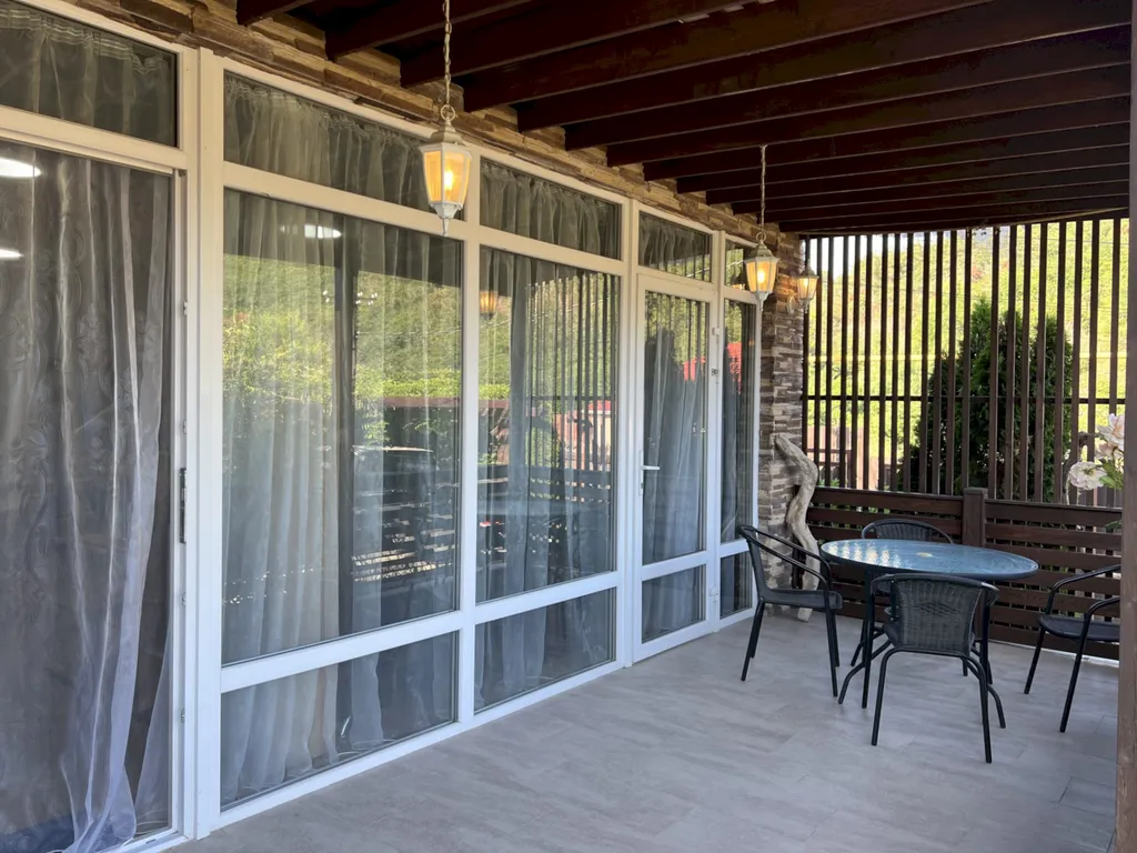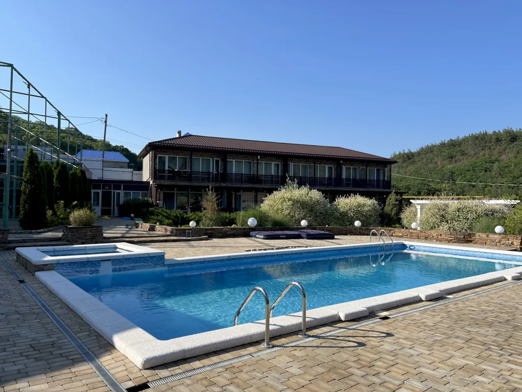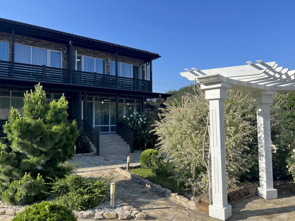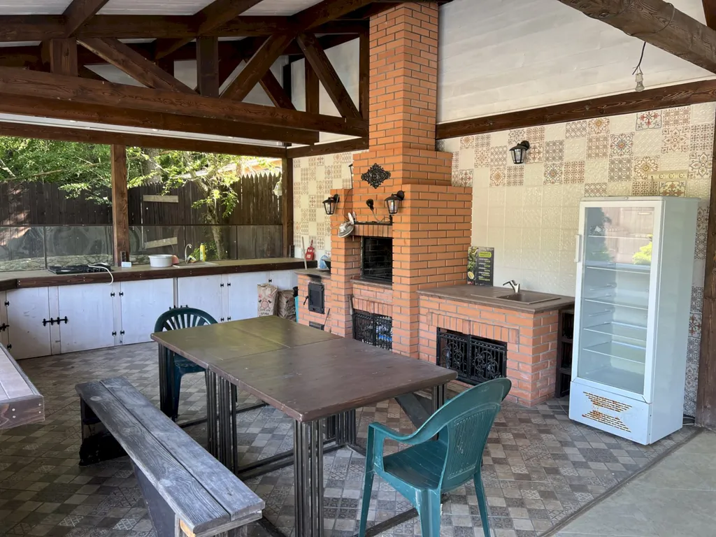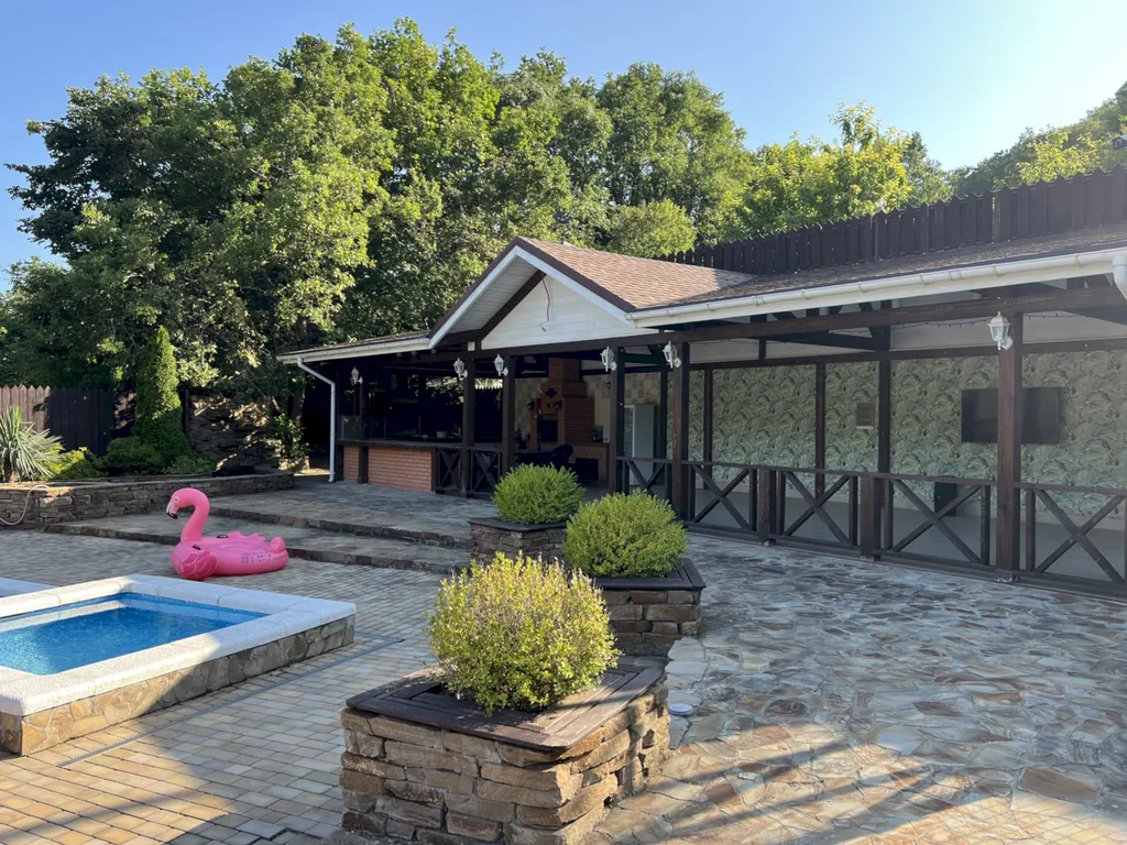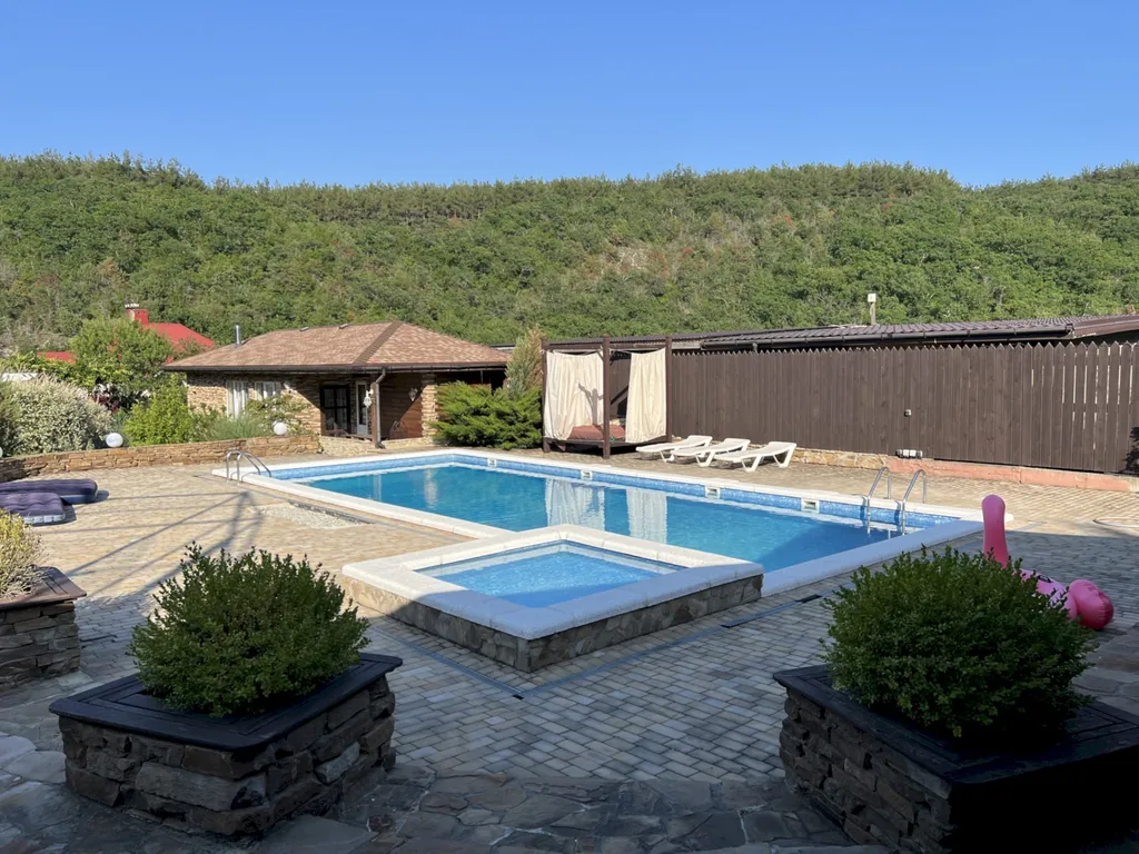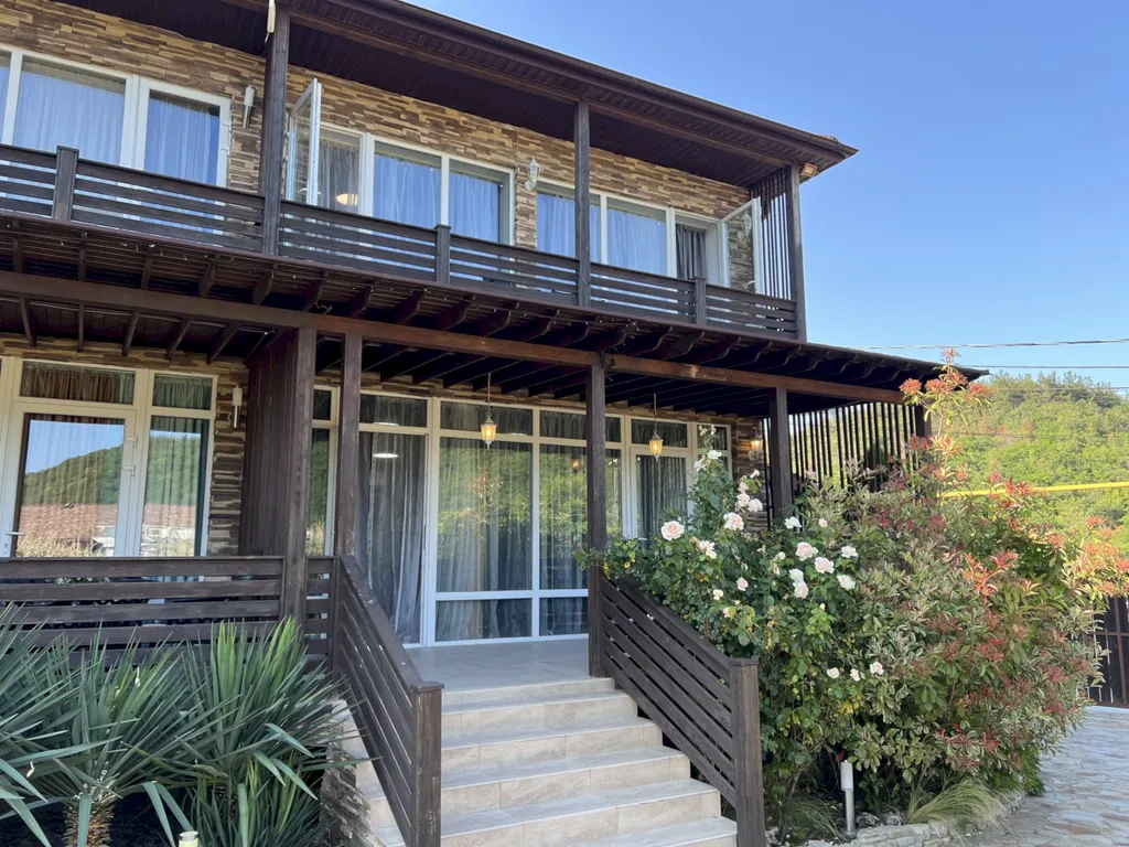 Двухэтажный таунхаус в лесном массиве, вид на горы, терраса, бассейн, шезлонги, зелёный двор, парковка, баня на дровах, необходимая техника