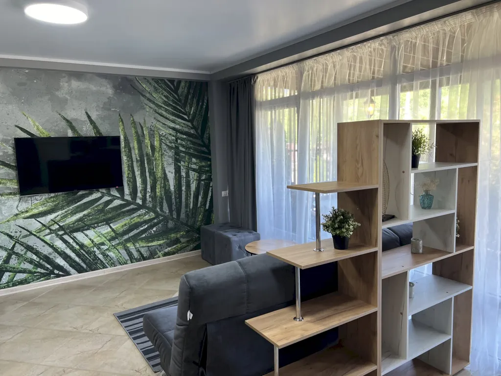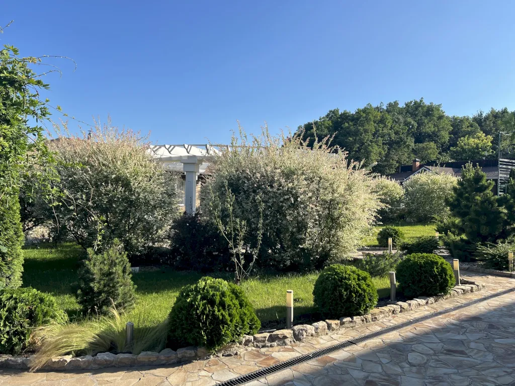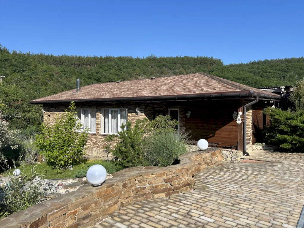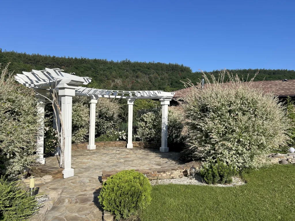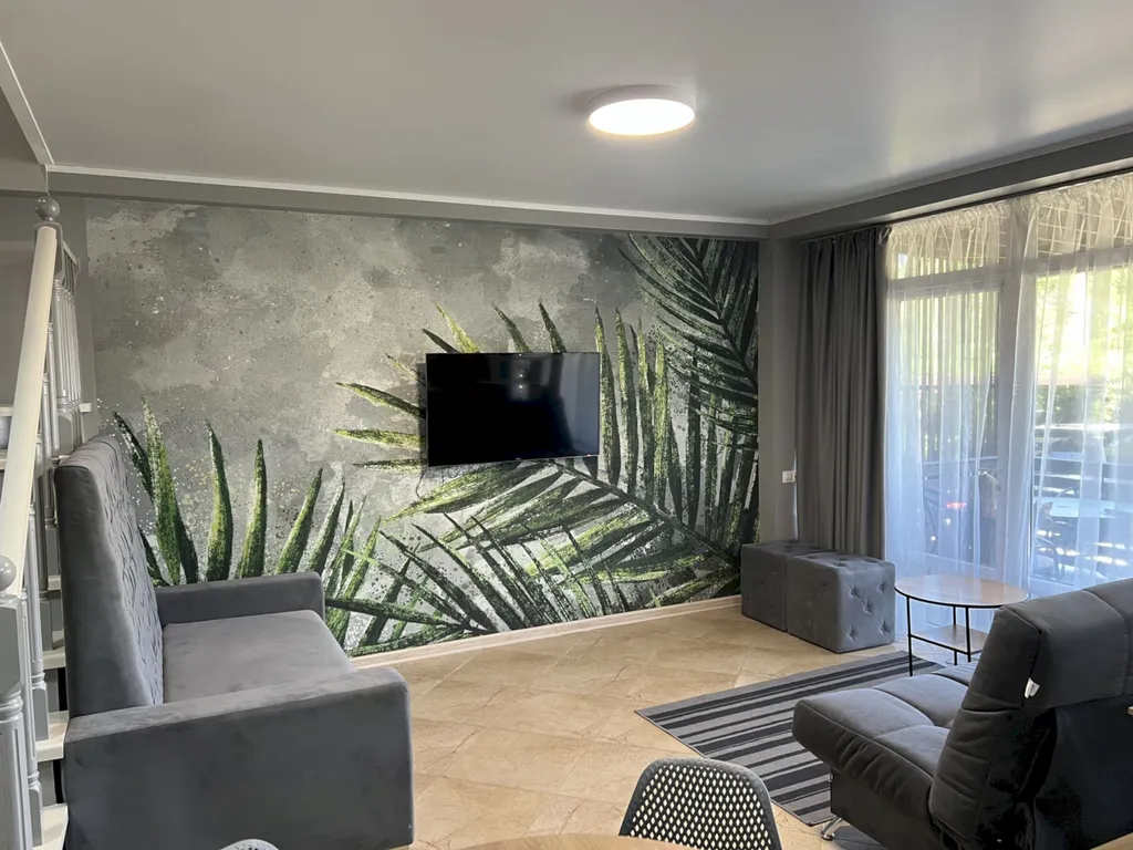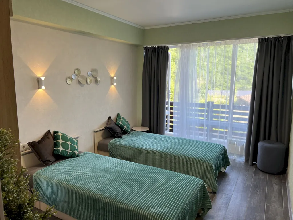 Двухэтажный таунхаус в лесном массиве, вид на горы, терраса, бассейн, шезлонги, зелёный двор, парковка, баня на дровах, необходимая техника