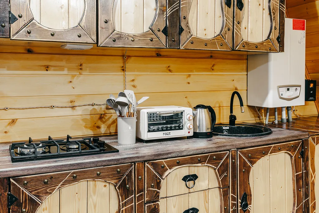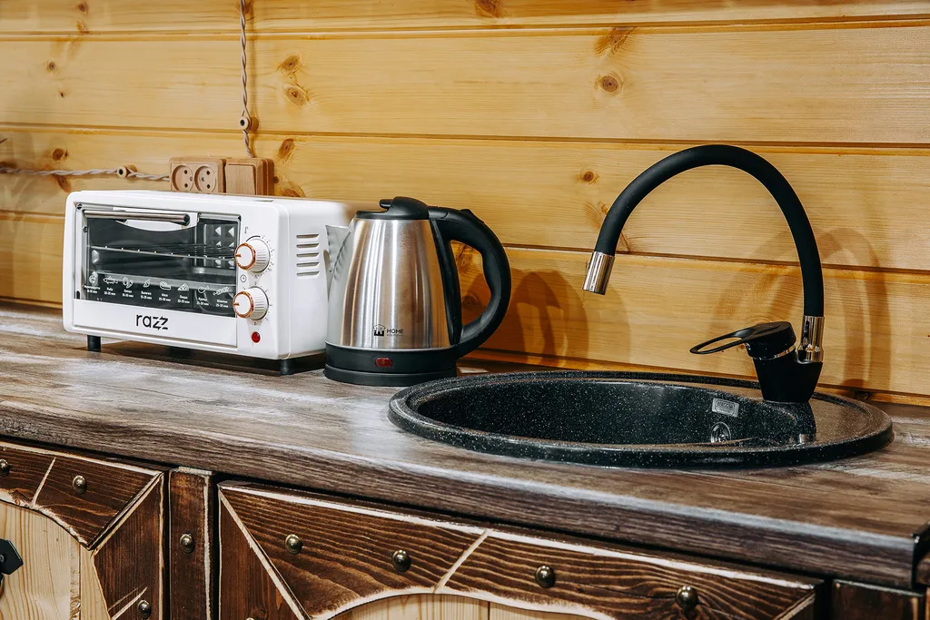 Оборудованная кухня: посуда, холодильник, микроволновка, кастрюли, сковорода, электрический чайник, чай, кофе, сахар.