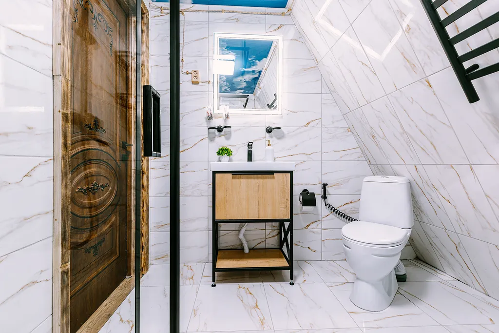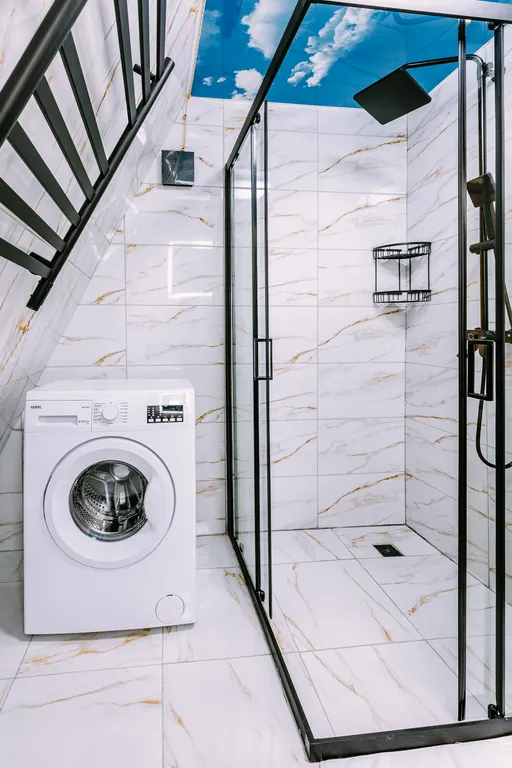 Ванная с душем, стиральная машина, фен, утюг, гладильная доска, тапочки, сушилка, шампунь, мыло.