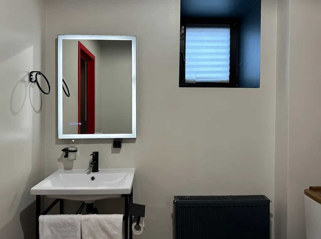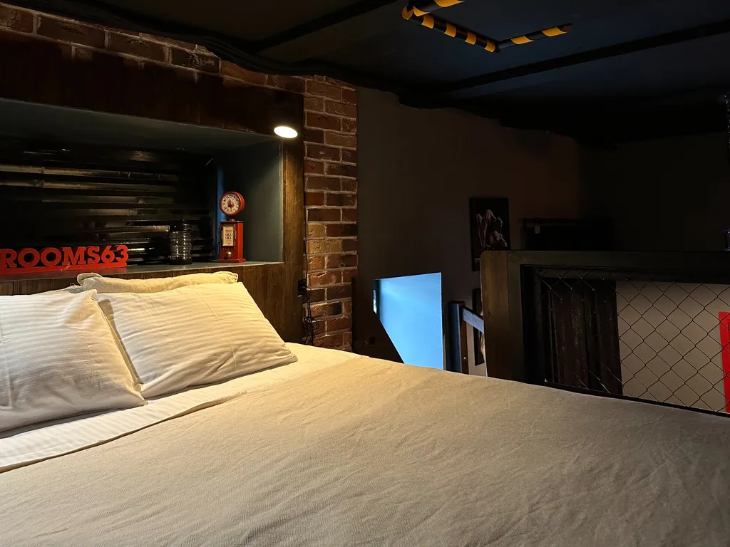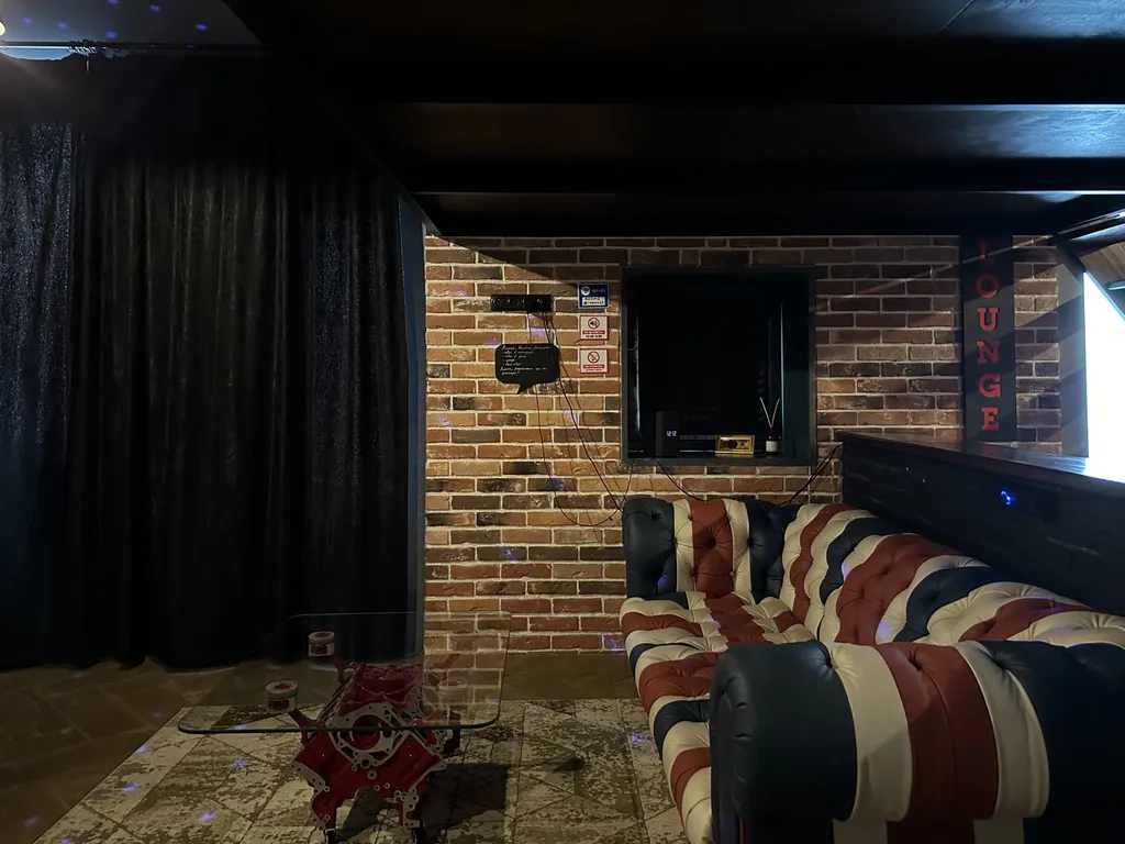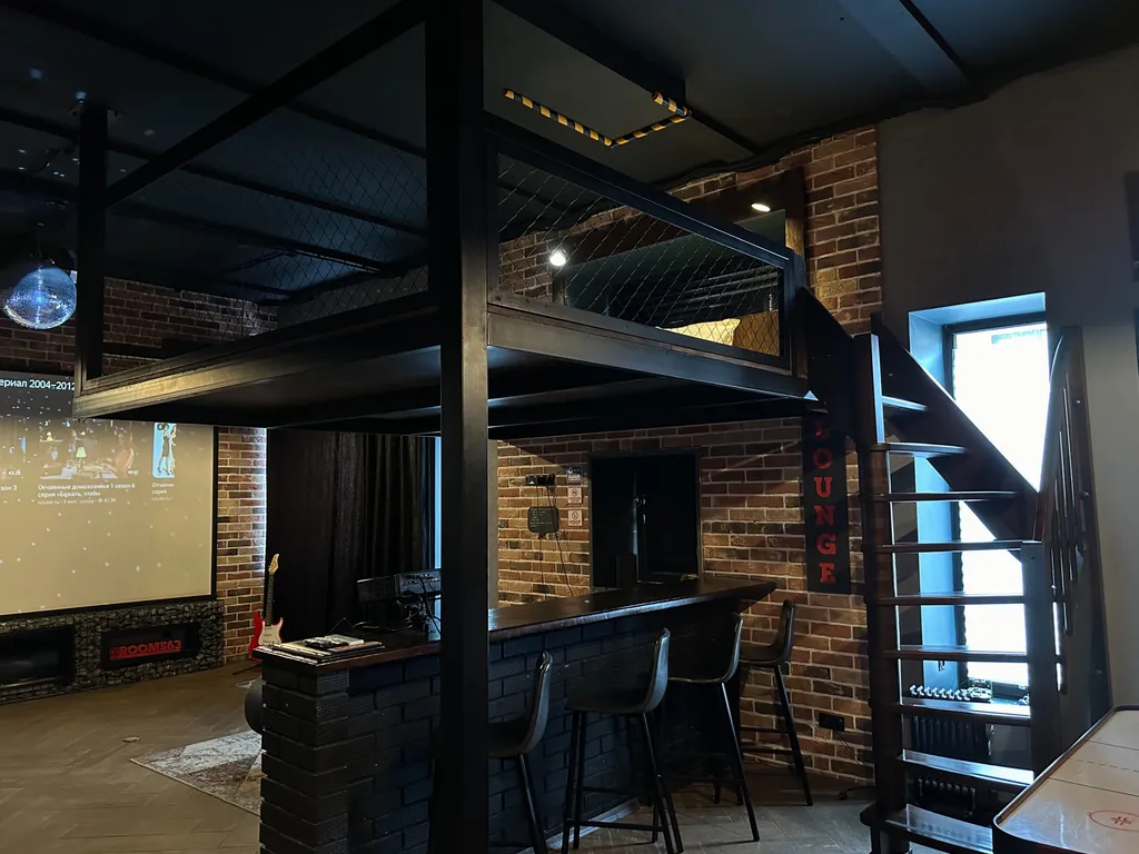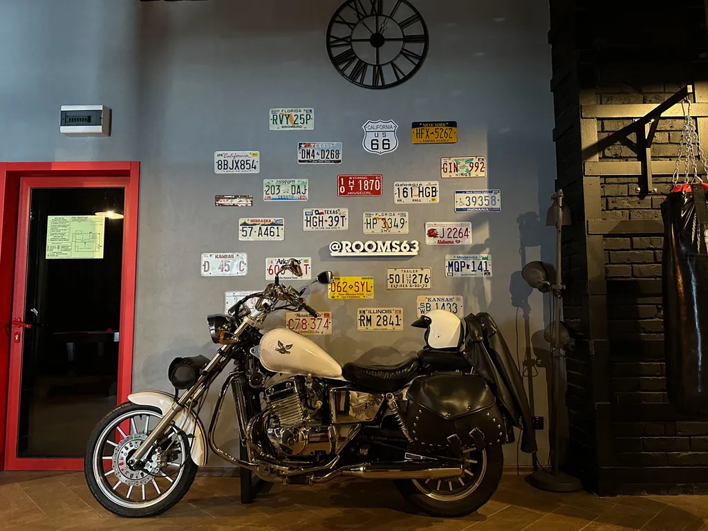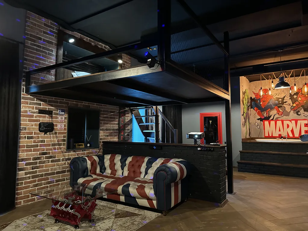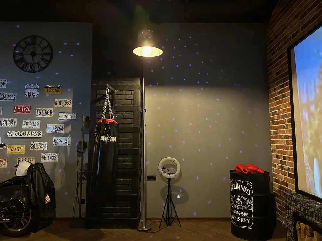 Здесь есть огромная круглая джакузи, шест для стриптиза и дискошар, кинотеатр с огромным экраном, проектором, Яндекс станцией, которая управляет освещением и подключена к Кино.Поиску, кальянная зона с дизайнерским диваном, большой биокамин, настоящий мотоцикл, второй этаж с кроватью, барная стойка, санузел с душем. Каждый уголок этого номера это фотозона, есть фотолампа. На каждом этаже кофемашина, холодильник, кулер, микроволновка, посуда.
