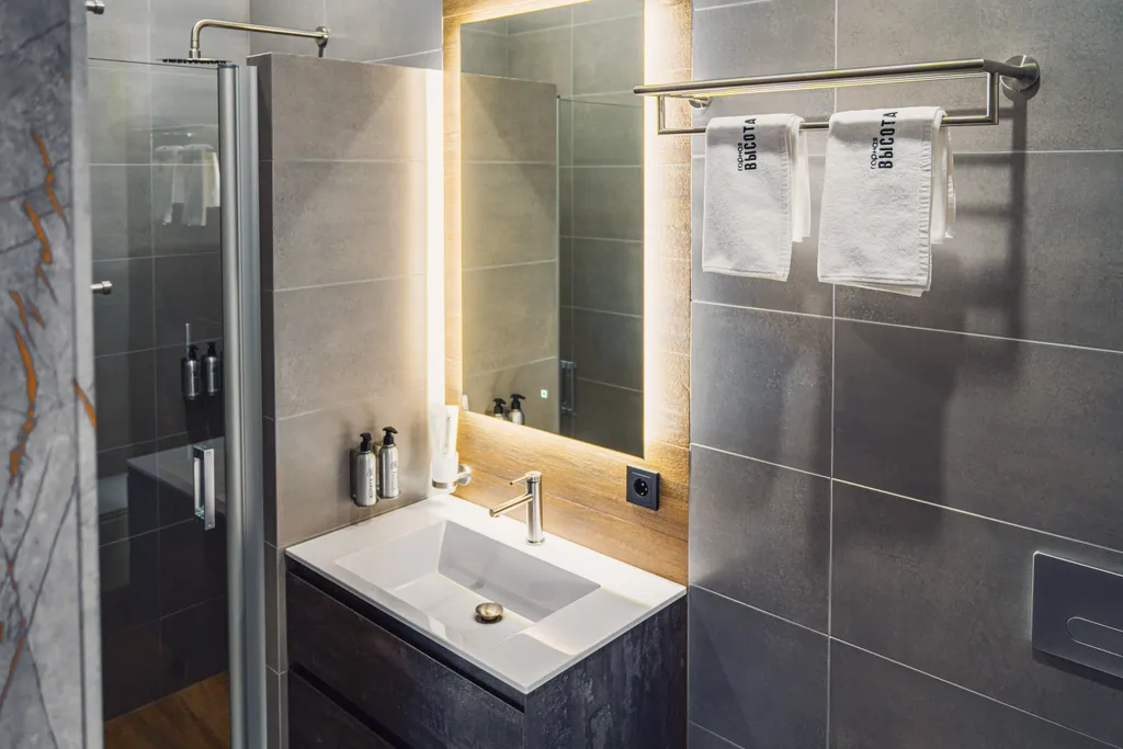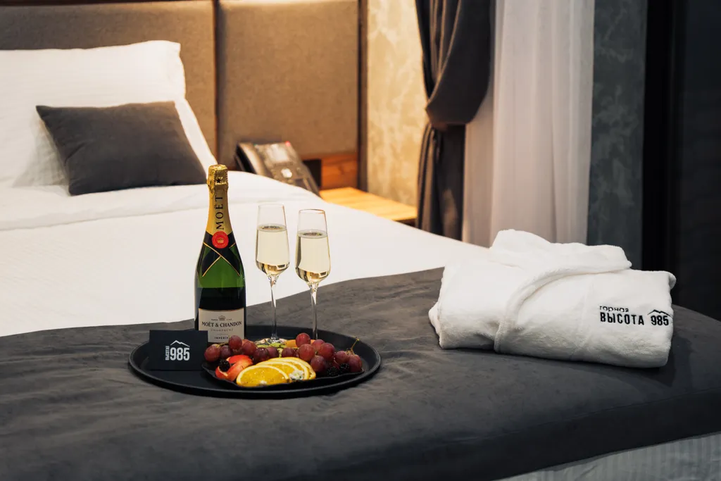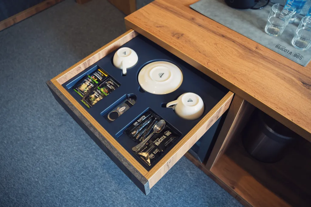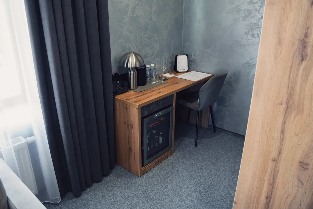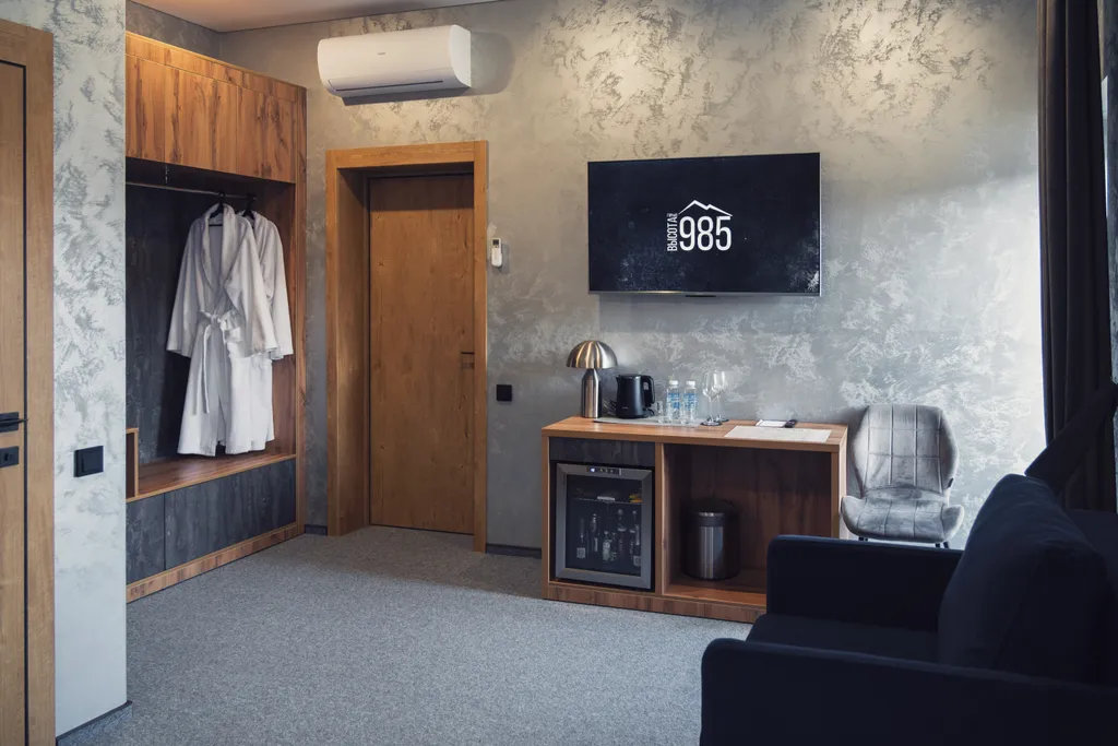 В номере предусмотрены все современные удобства:телевизор с диагональю 50 дюймов для развлечений,принадлежности для приготовления чая и кофе для уютных моментов,а также сейф для хранения ценных вещей и мини-бар с разнообразными напитками.