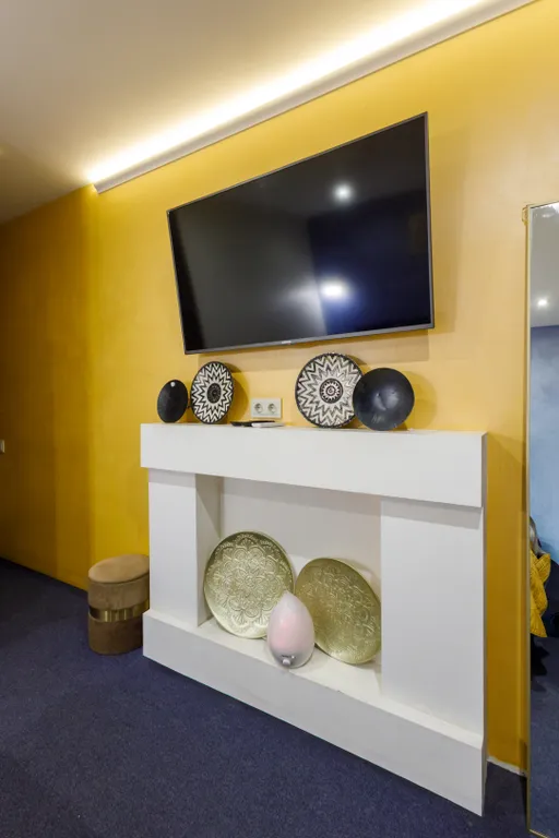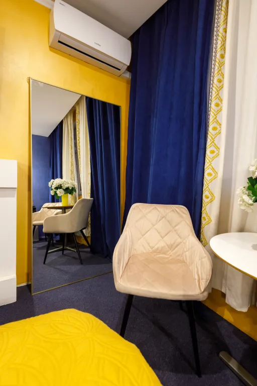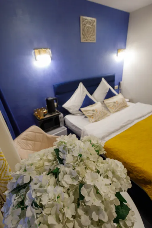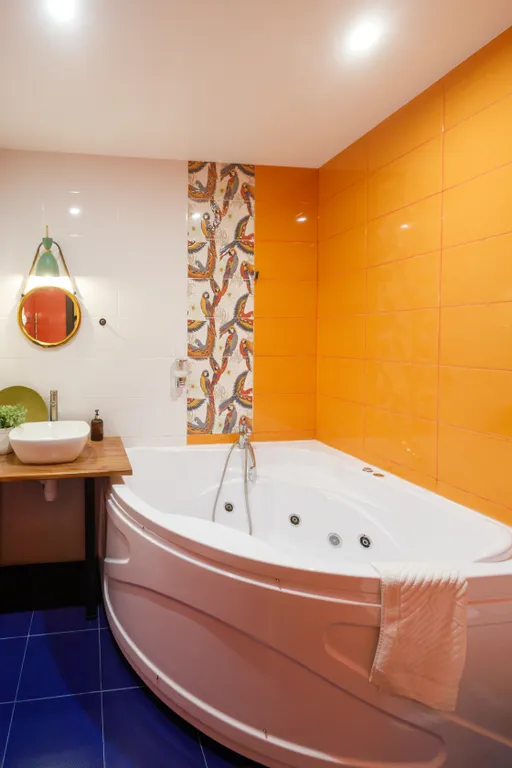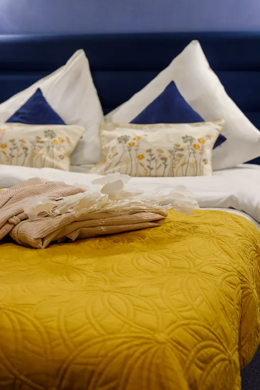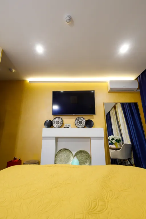 Оборудование номера: большая ванная джакузи для двоих, фен, спутниковое тв, кровать king-size, кондиционер, мини-холодильник, постельное бельё, полотенца, тапочки, халаты, средства гигиены.
