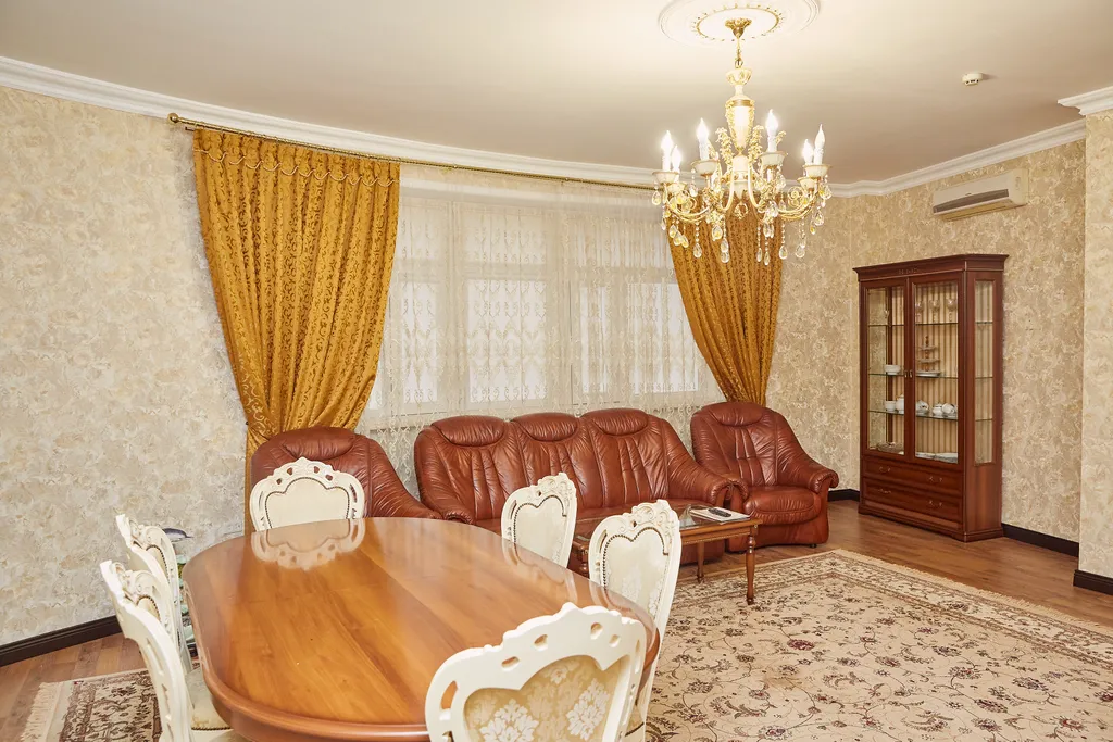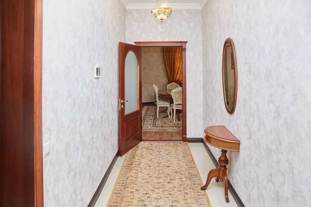 В спальне имеются: удобная двуспальная кровать, прикроватные тумбочки, туалетный столик, гардероб, комод с зеркалом, светильники.