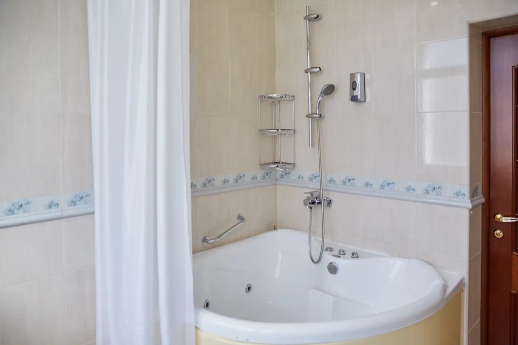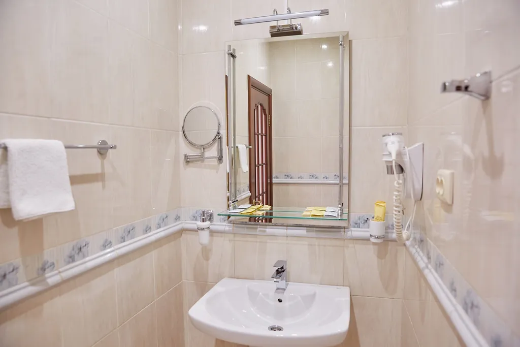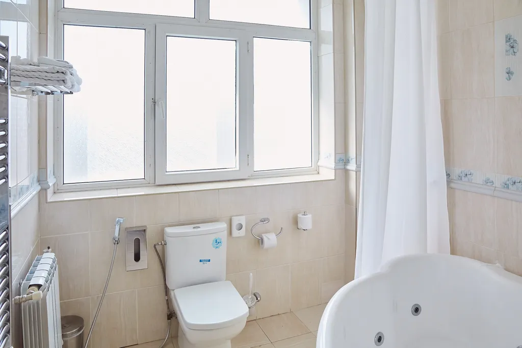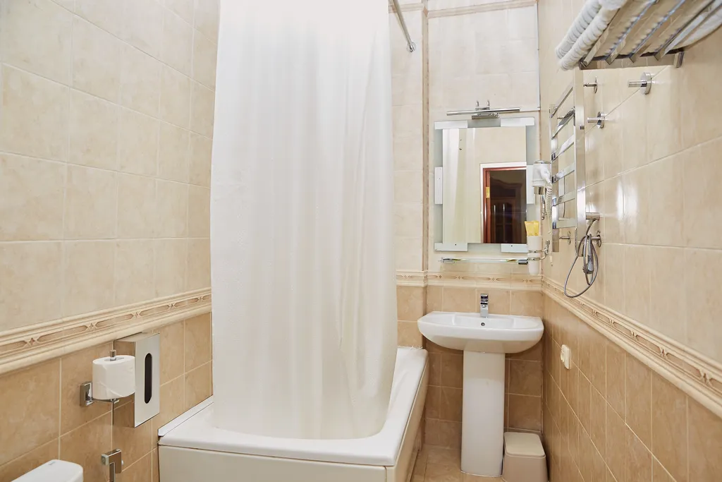 В ванной комнате: гидромассажная ванна, фен, туалетные принадлежности: (мыло, гель для душа, шампунь, зубная паста и щетка, шапочка для душа), комплект полотенец, халат и тапочки.