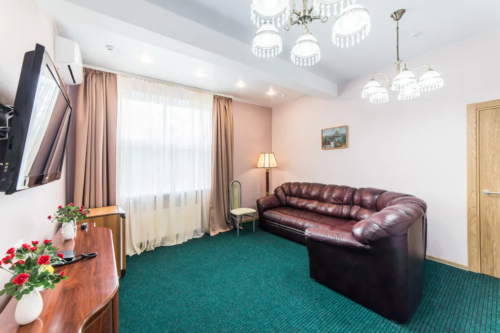 Уютный двухкомнатный люкс №6 с двуспальной кроватью состоит из спальной комнаты, гостиной с большим кожаным диваном, небольшого холла и совмещенного санузла с джакузи. Номер расположен во 2 корпусе.