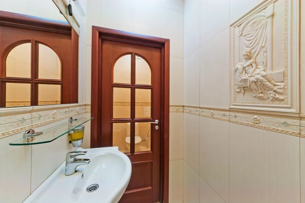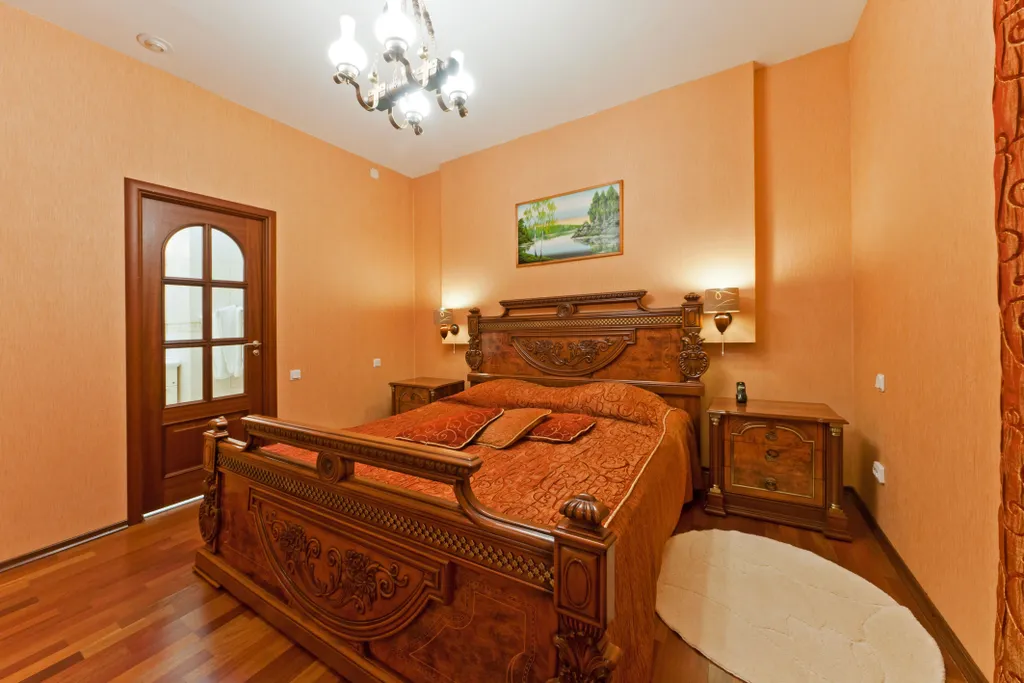 Уютная спальная комната с резной мебелью; гостиная с электрическим камином, белой кожаной мебелью и креслом-качалкой, воздушный текстиль, панорамные окна; кухня оборудована варочной панелью, холодильником, СВЧ-печью, есть вся необходимая посуда; ванная комната с джакузи и лепниной по периметру, отдельный санузел для гостей. В номере есть сейф.