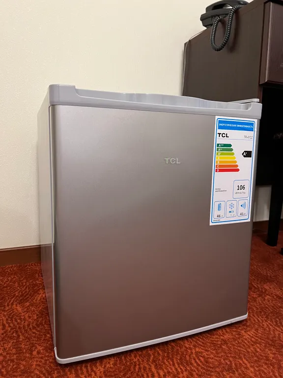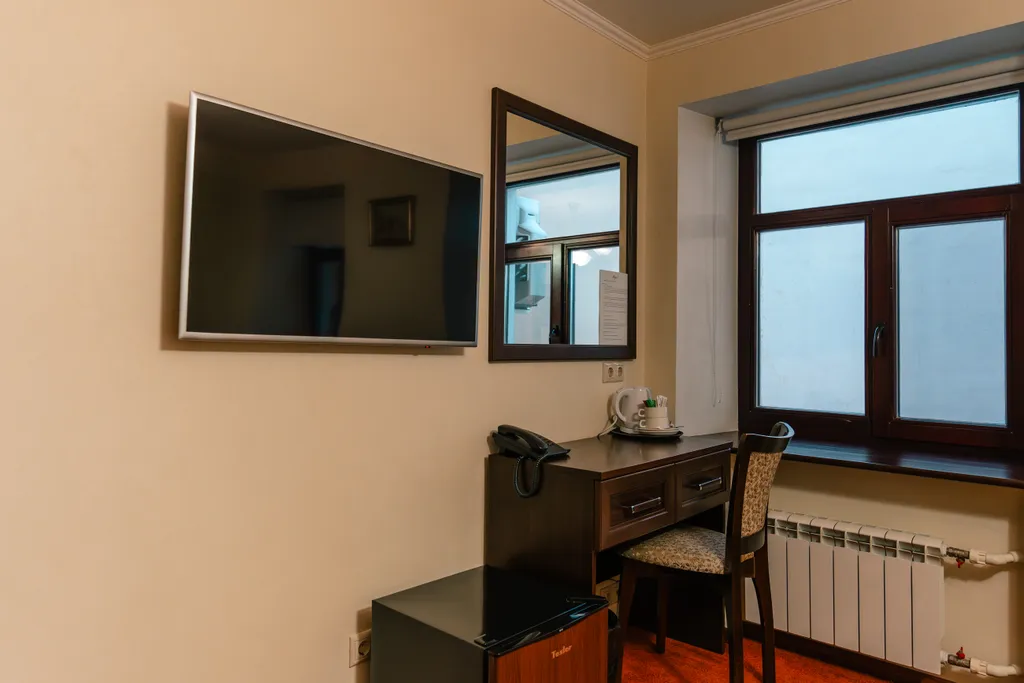 В номере телевизор, кондиционер, холодильник, чайник, фен.
