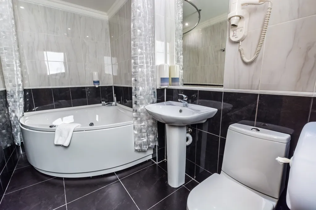 - Просторная ванная комната с ванной-джакузи, феном и набором индивидуальных косметических принадлежностей