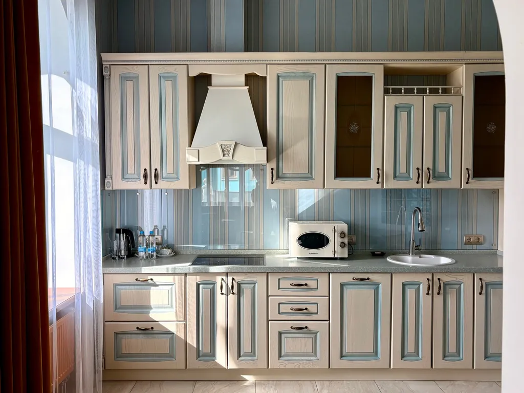 Имеется сейф, телевизор, кондиционер, шкаф, вешалка, обеденный и рабочий столы, журнальный столик, электроплина, свч, чайник, холодильник, посудомоечная машина, стулья.