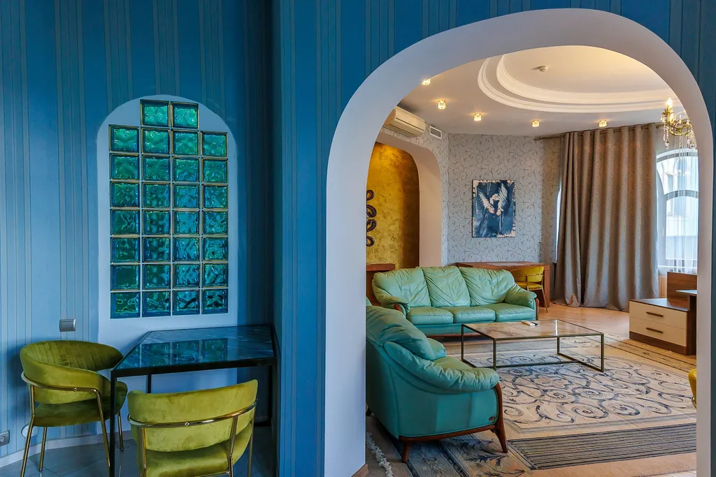 Имеет спальню с приятным интерьером.