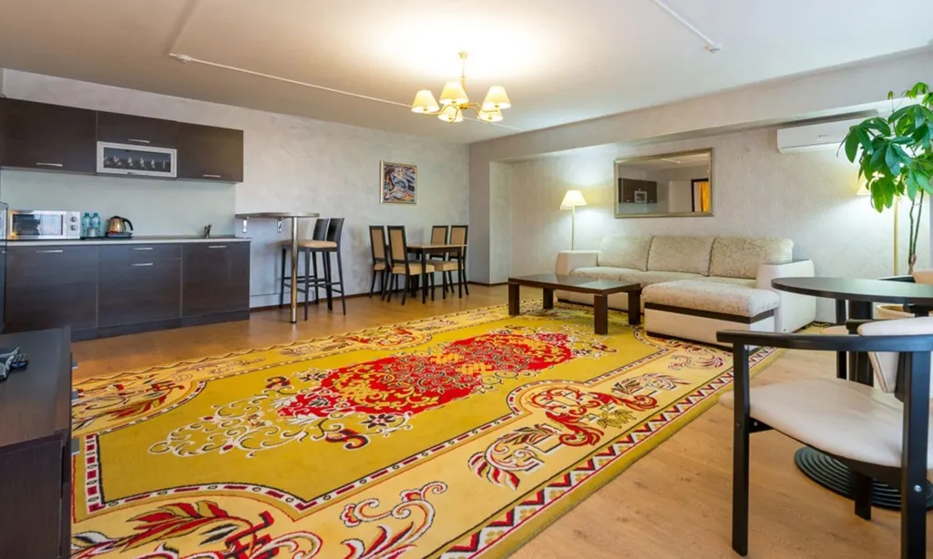 Роскошный трехкомнатный номер с гостиной (в которой оборудованы кухонная и обеденная зоны), рабочим кабинетом, спальней и санузлом.