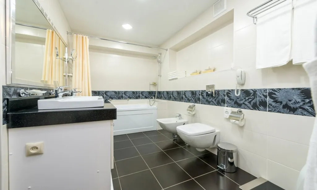 Для вашего комфорта санузел с ванной, фен, халат, комплект полотенец, косметические принадлежности и весы.