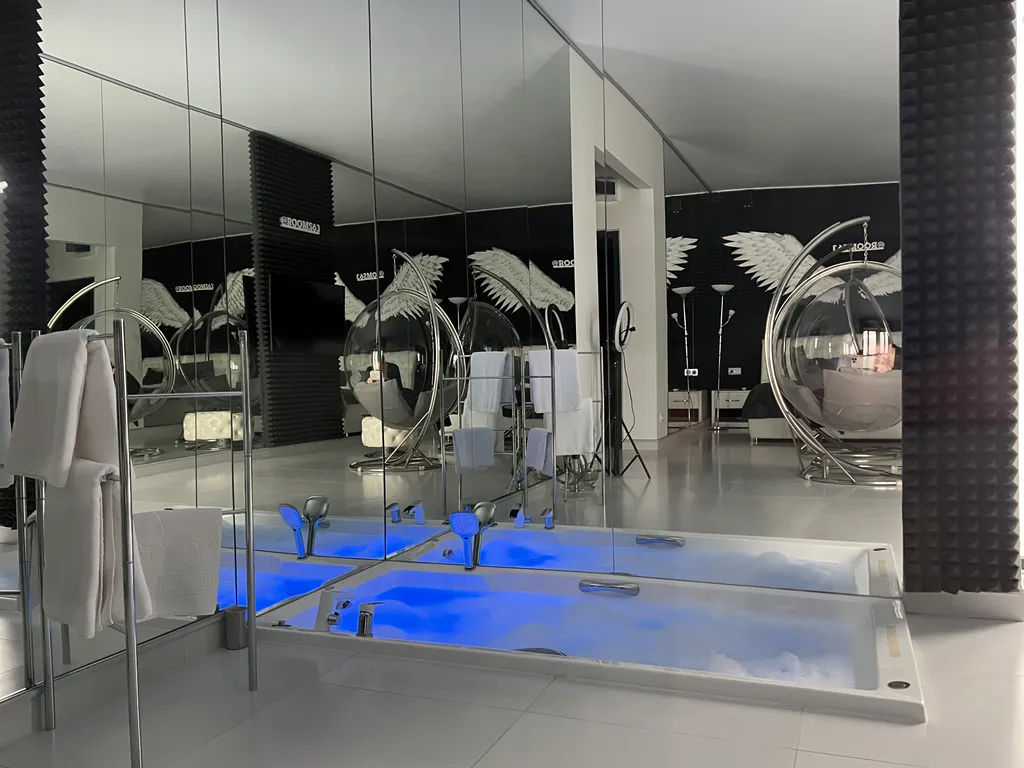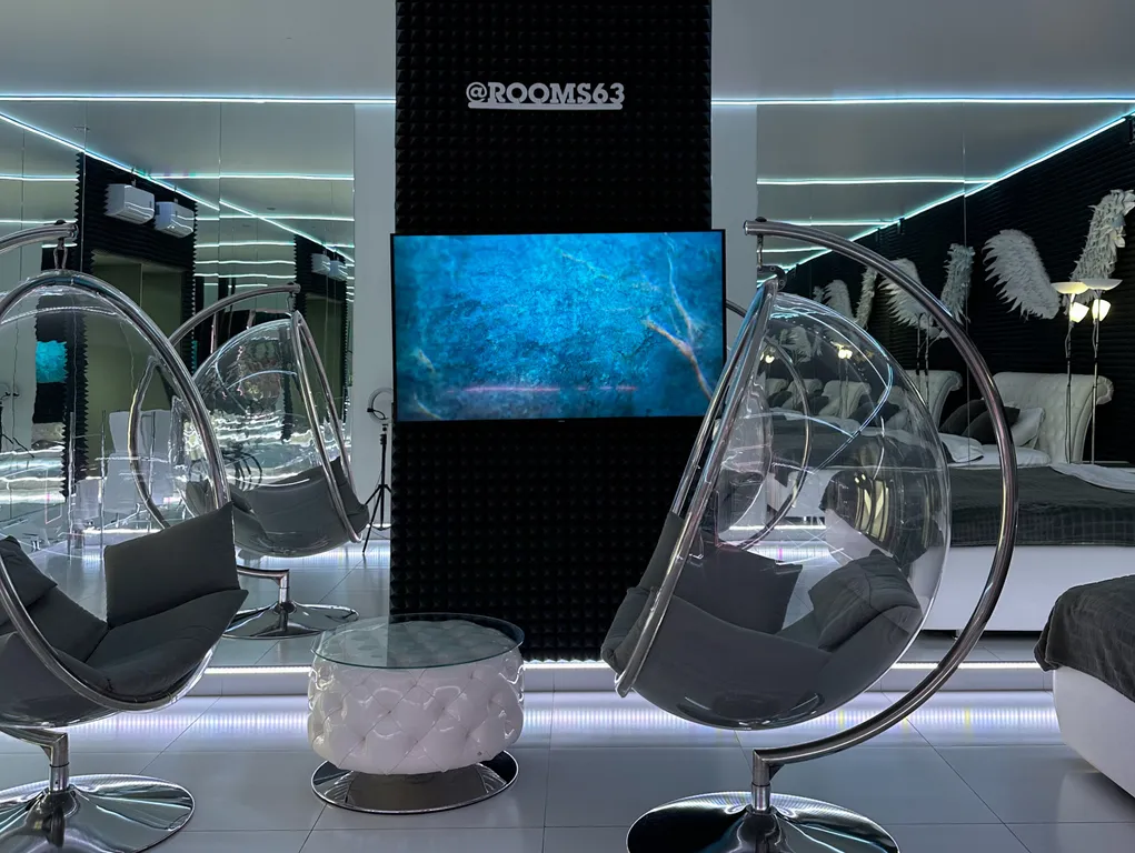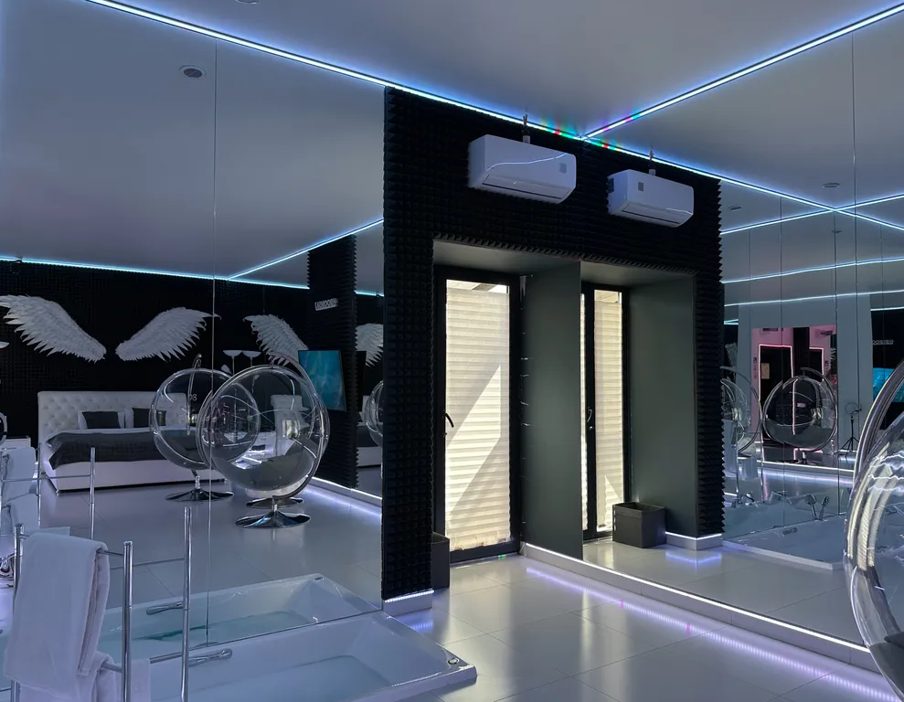 Зеркала на всех стенах делают его бесконечным. Здесь получится очень крутая фотосессия и сногсшибательное свидание-сюрприз. В номере свой балкон, стеклянные кресла-коконы, переливающаяся подсветка, фотолампа, джакузи в полу, кальян, большой 4К телевизор, санузел с душем. На каждом этаже кофемашина, холодильник, кулер, микроволновка, посуда.