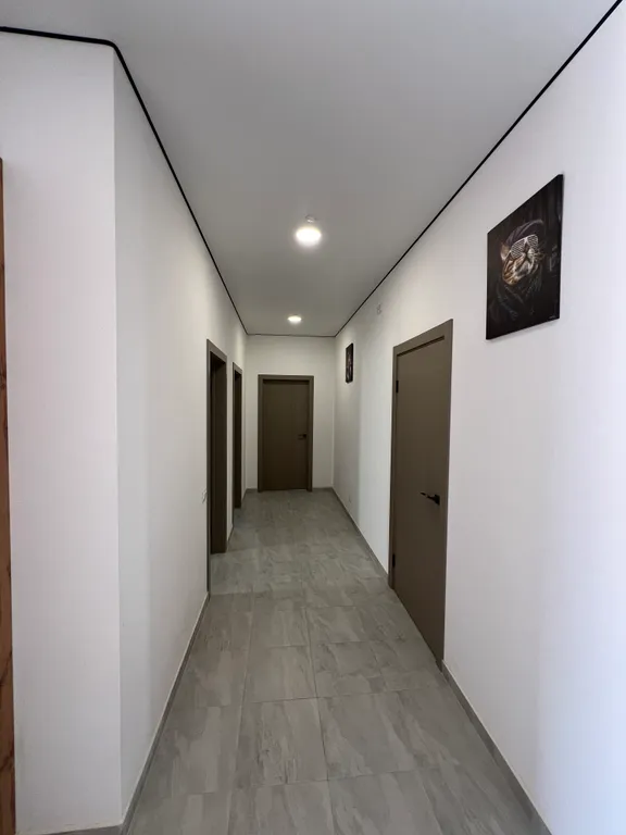 В доме 2 этажа. На первом этаже три комнаты, 2 сан. узла и 2 душа, а также большая гостиная с кухонной зоной. На первом этаже разместятся 10 человек.