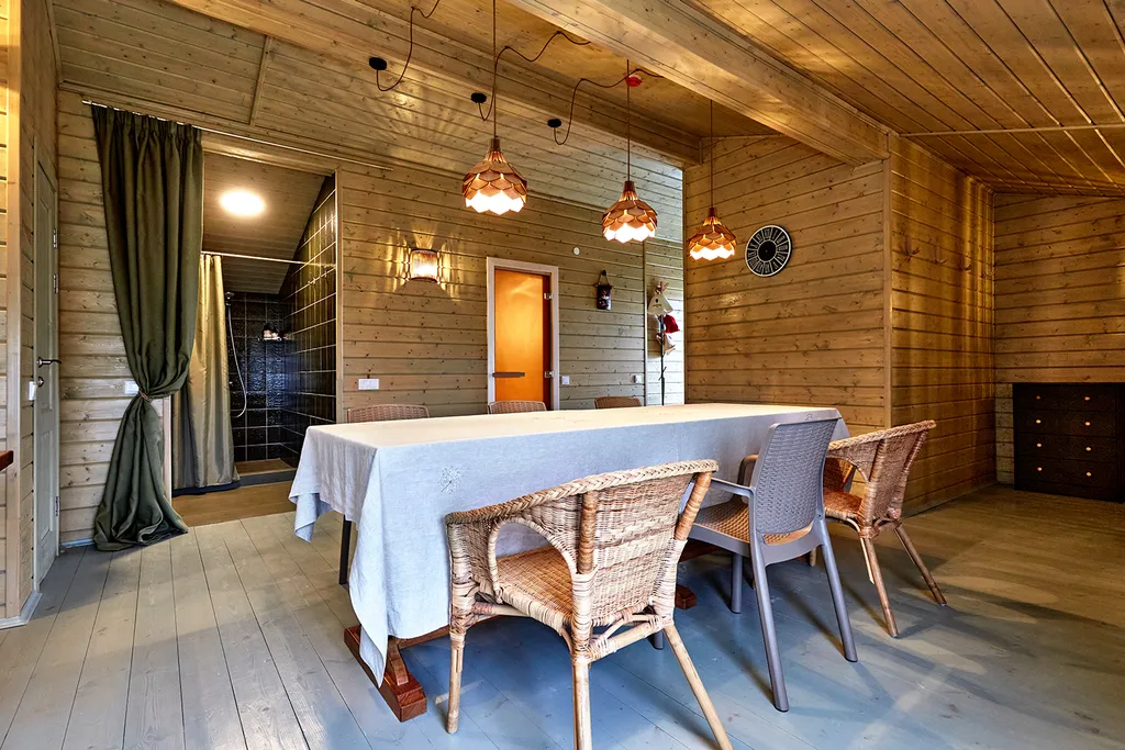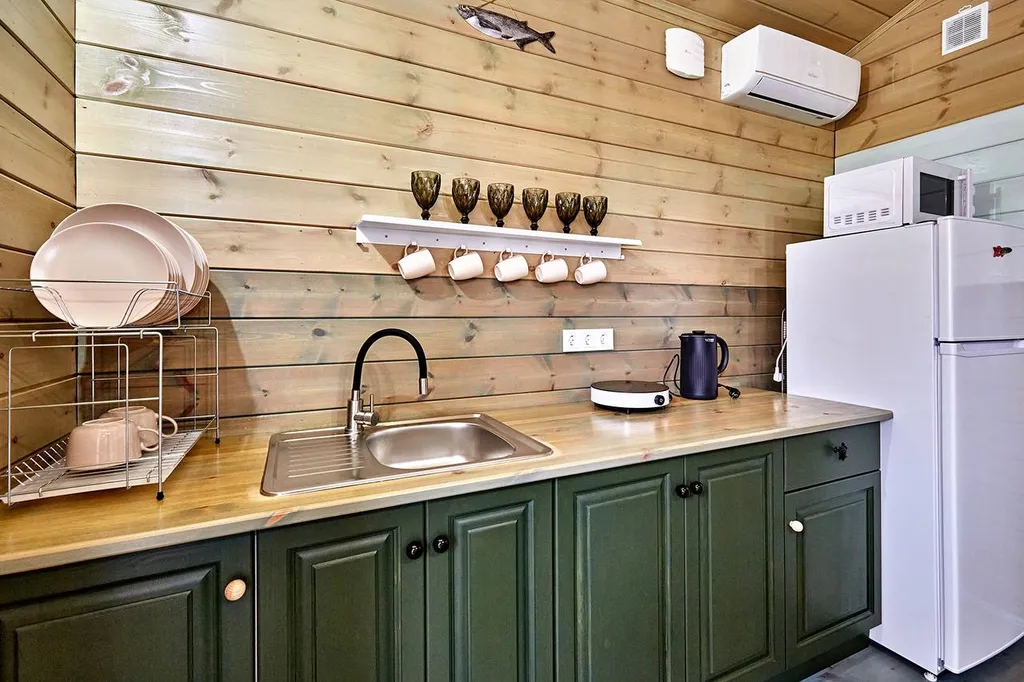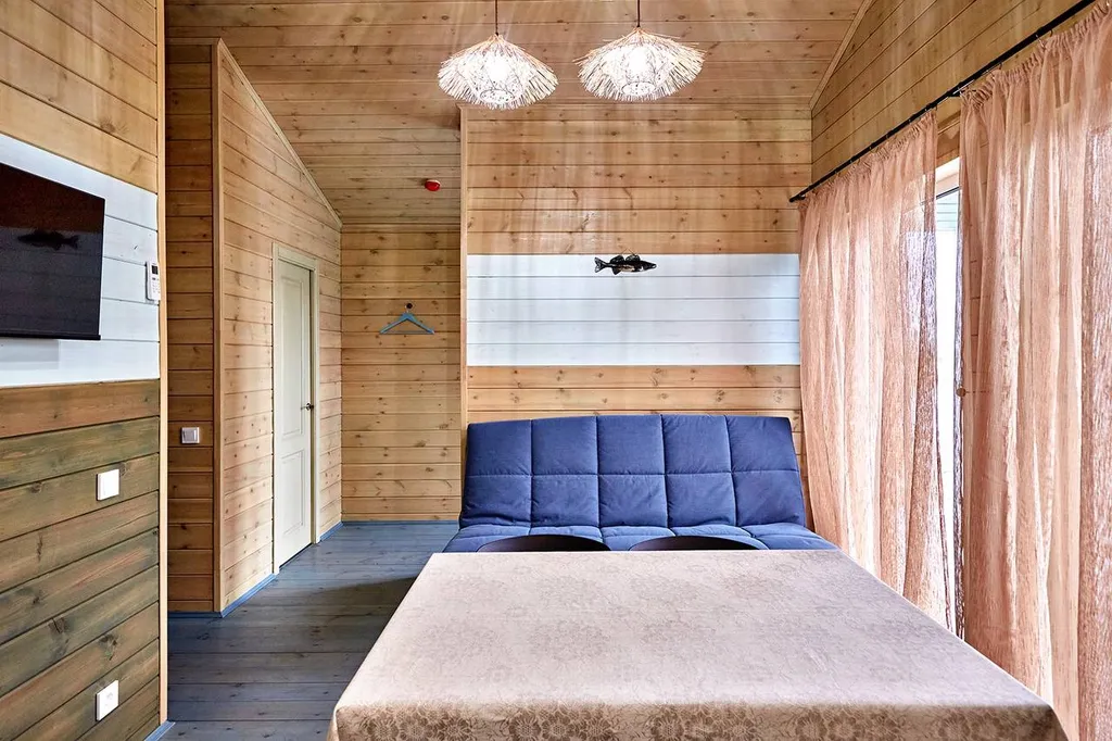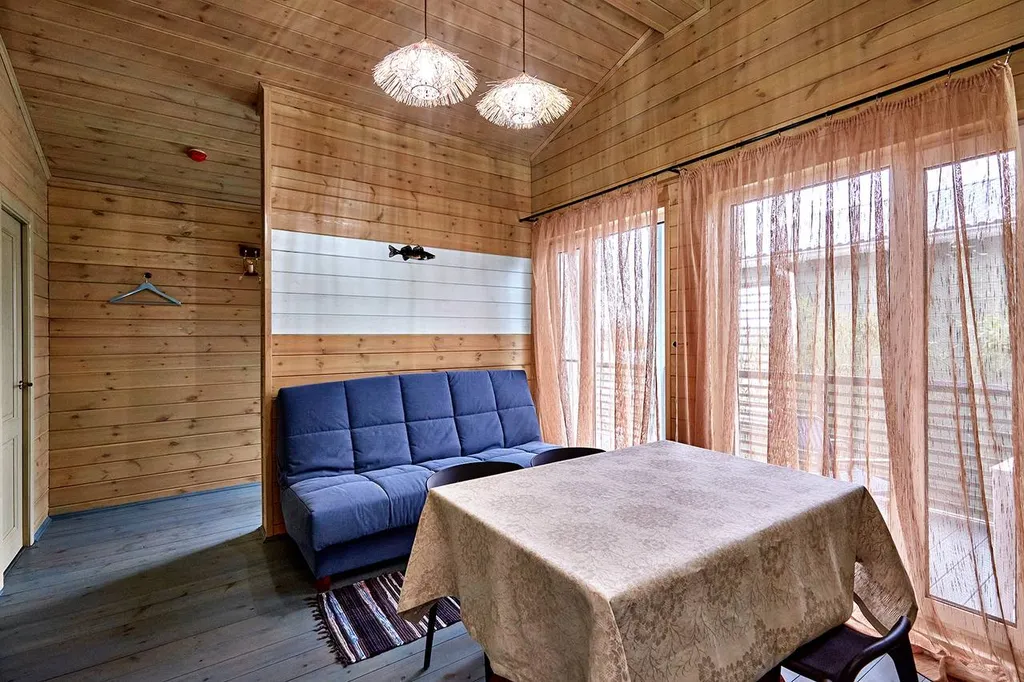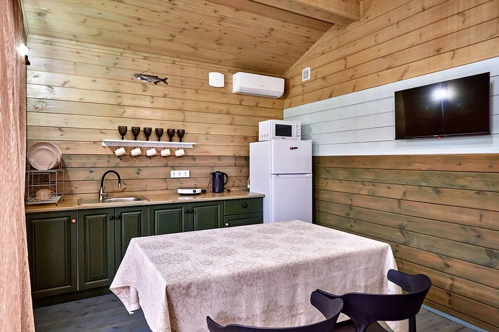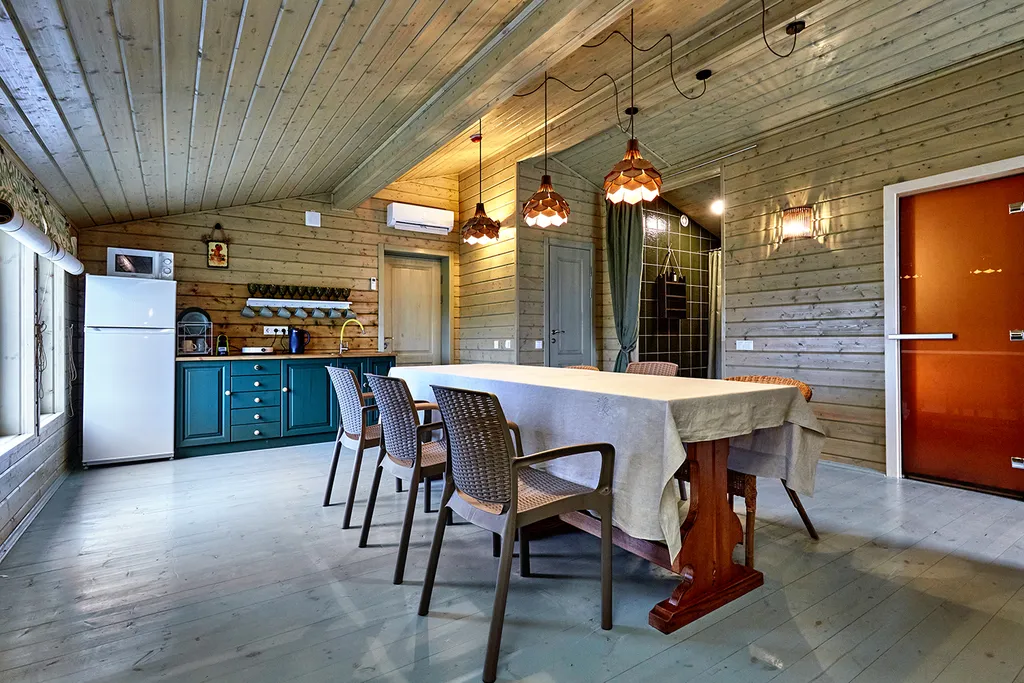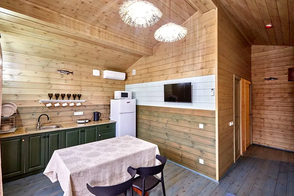 На территории комплекса домики с индивидуальным интерьером, которые оснащены всей необходимой техникой и посудой для приготовления пищи. Каждый домик вмещает разное количество отдыхающих, отдельные ванные комнаты, просторные кухни-гостиные с террасами.