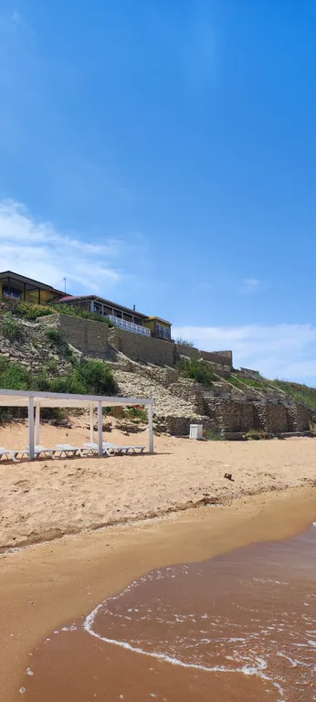- До пляжа 7–10 минут спокойным шагом, пляж оборудован навесами, лежаками, есть водные развлечения: надувные горки, бананы, сапы;