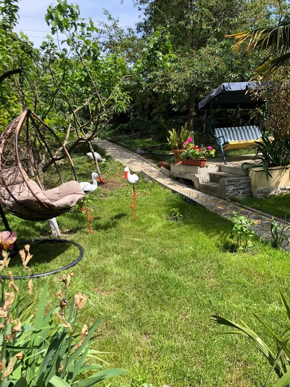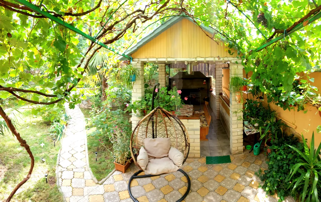 Двор-сад: беседка-утопающая в виноградной лозе, цветах и зелени, летняя кухня - посуда, плита, холодильник, стиральная машина,