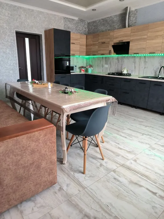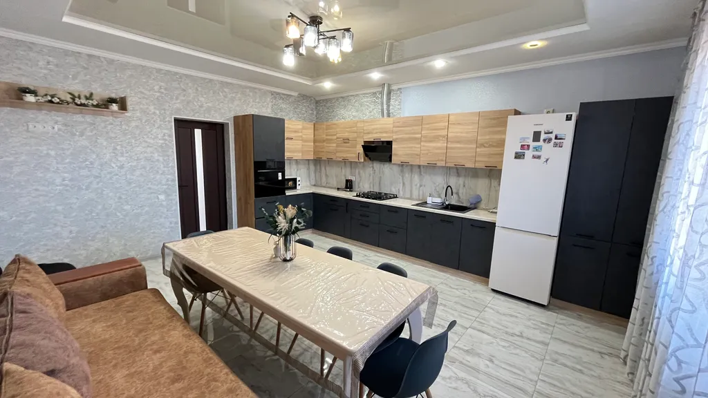 Большая кухня оборудована всей необходимой бытовой техникой и посудой.