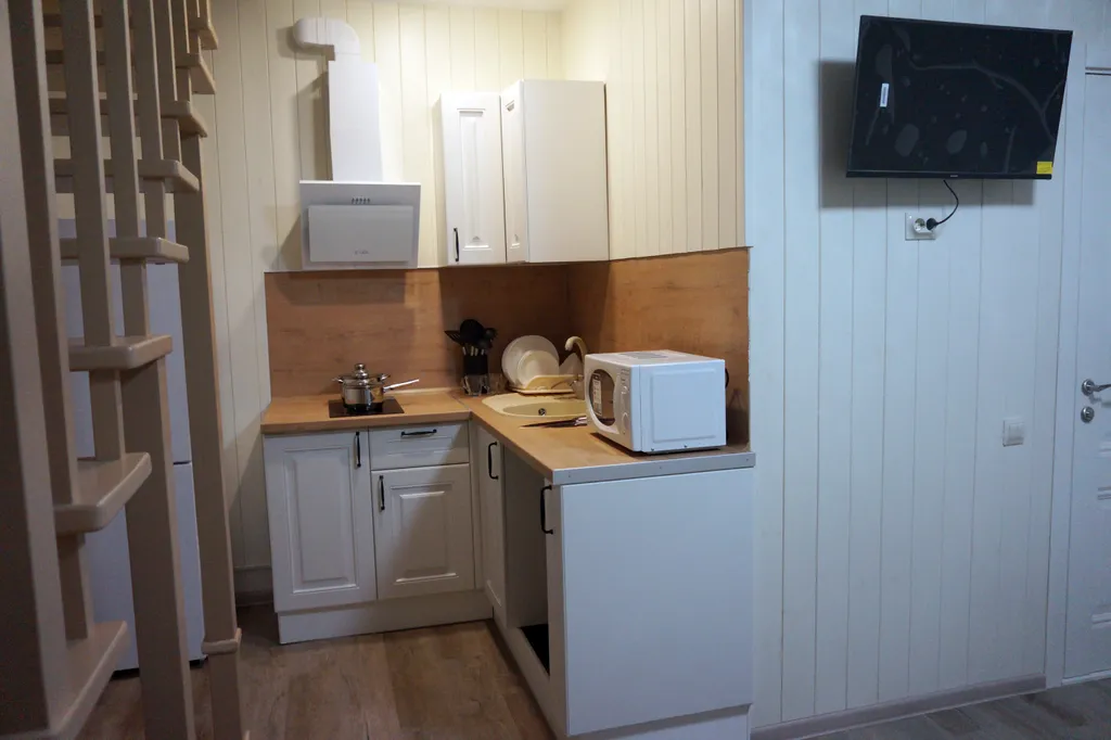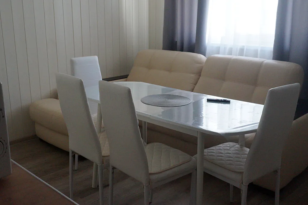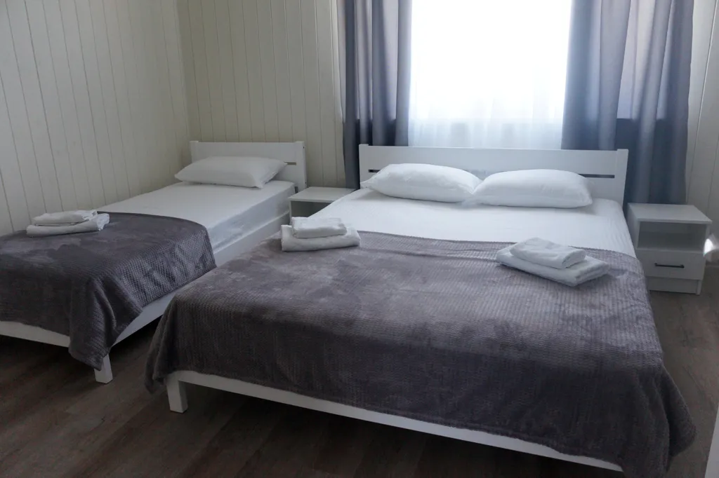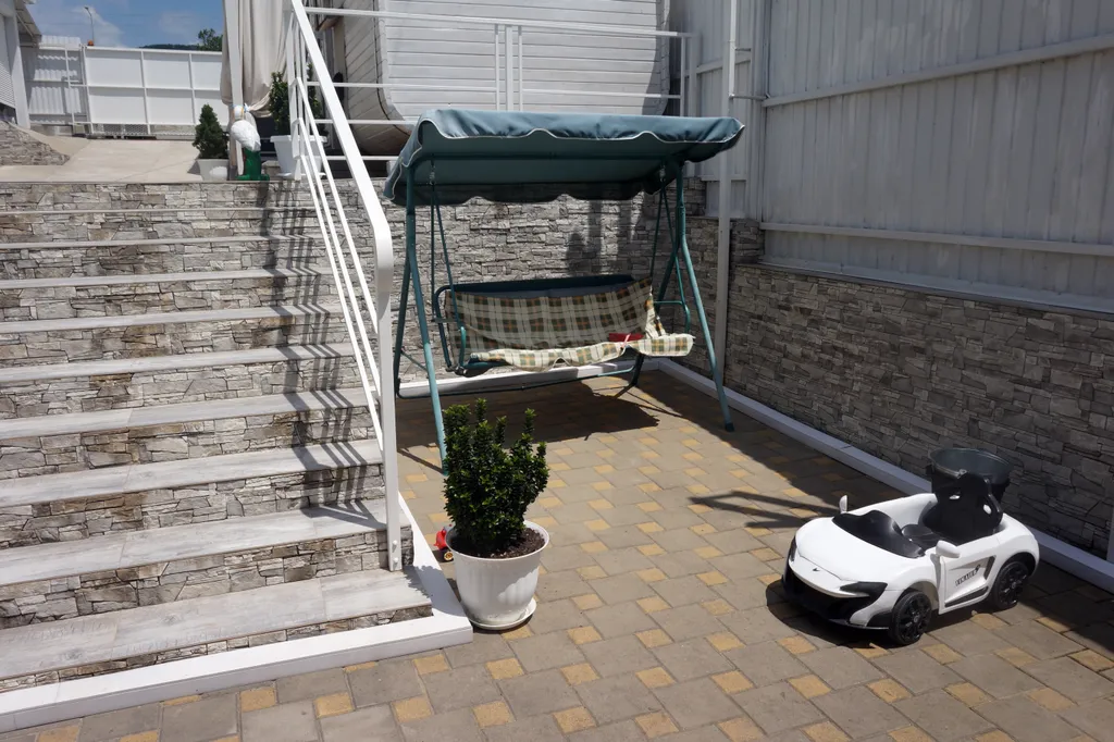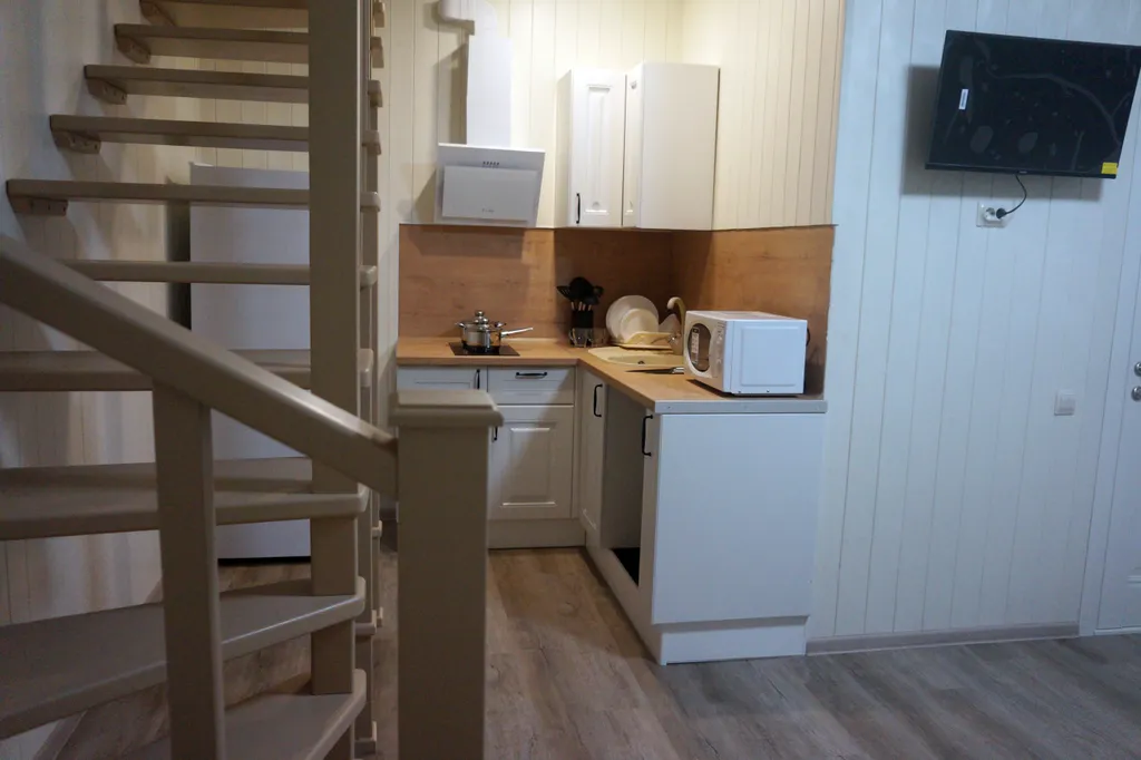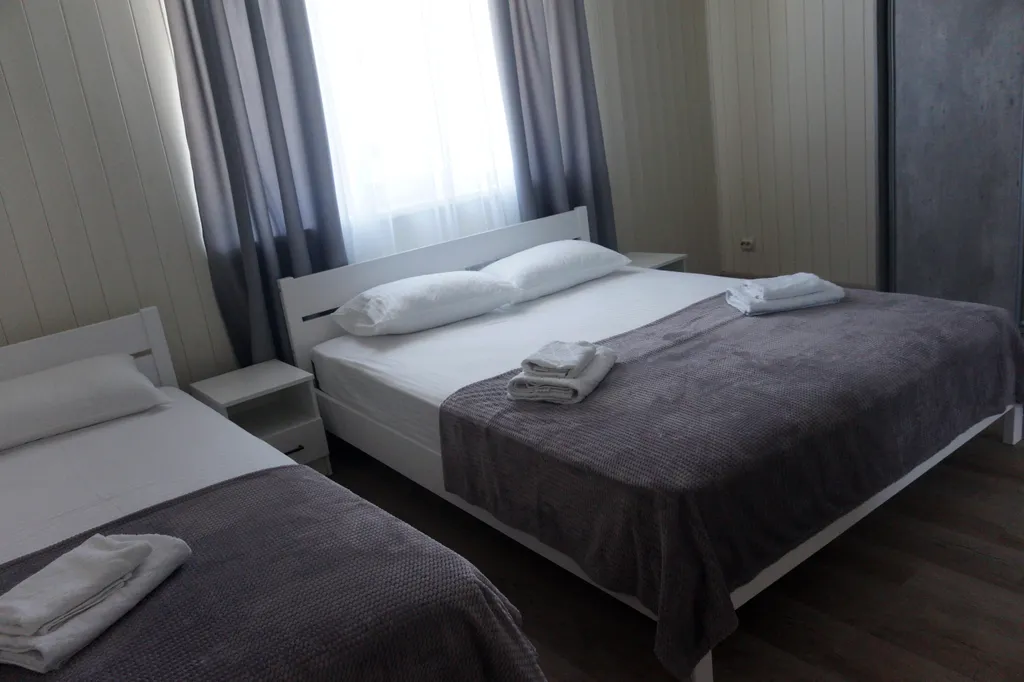 Домики в два этажа со всеми удобствами, кухней, верандой, стиральной машинкой, тv, wi-fi. На первом этаже домика кухня гостинная с двухспальным диваном. На втором этаже две спальни. В первой двуспальная кровать, во второй двуспальная и односпальная кровати. На территории 4 домика. Зона отдыха и бассейн для гостей четырёх домиков.