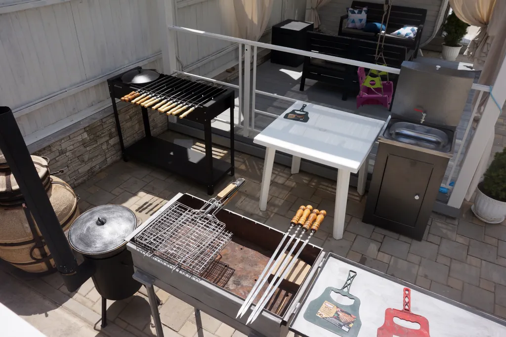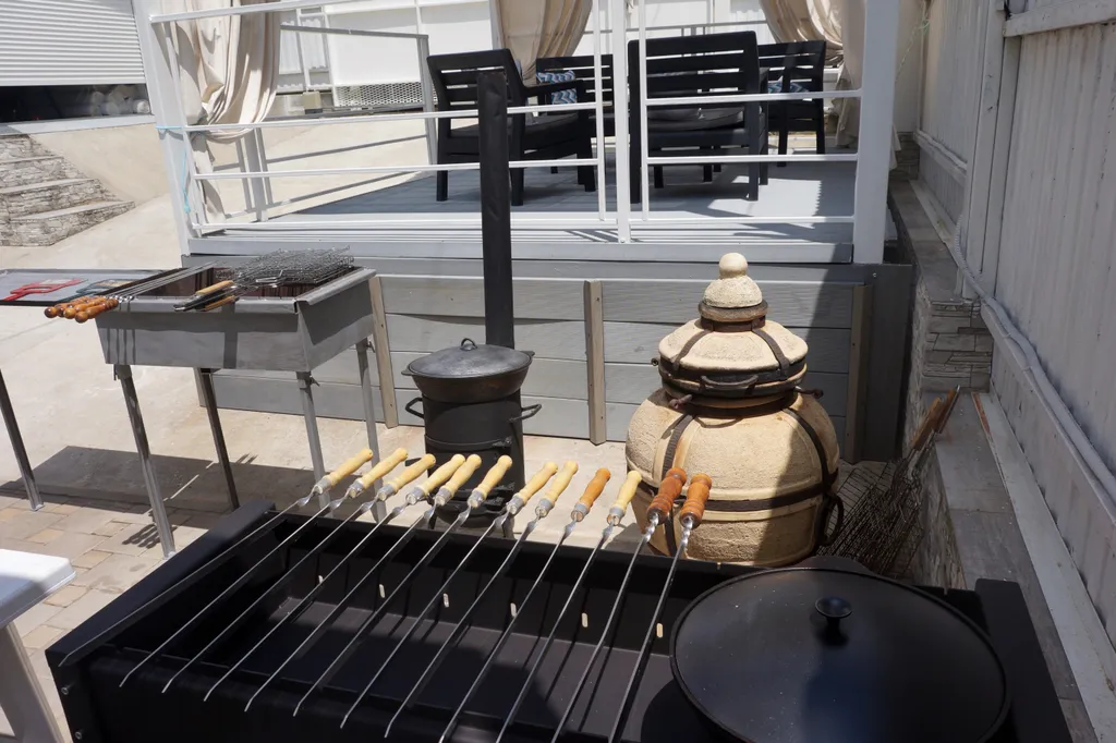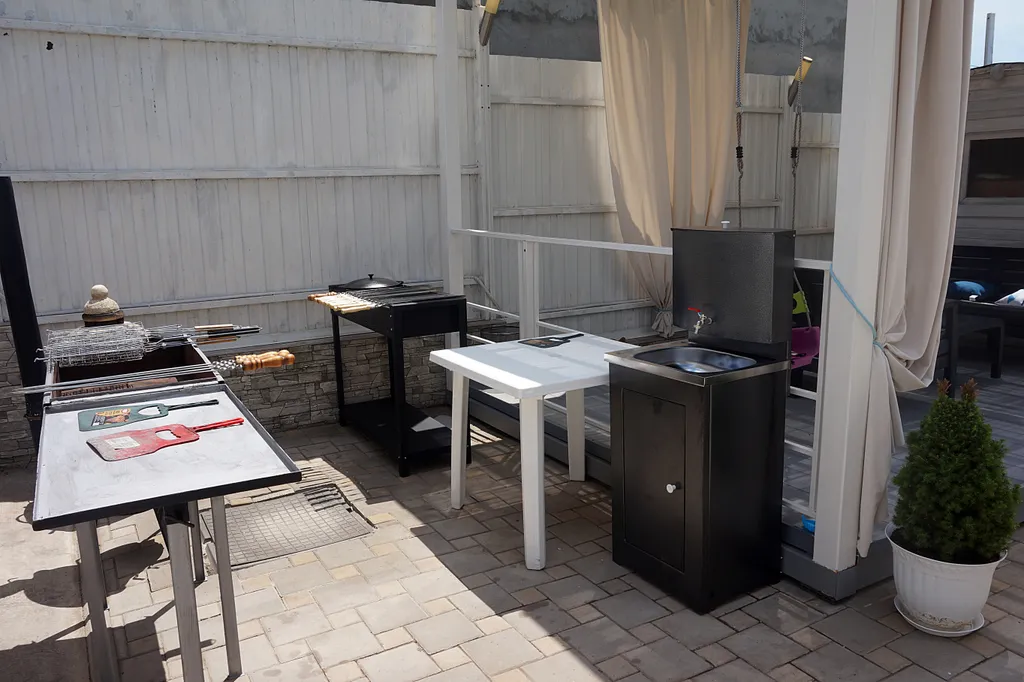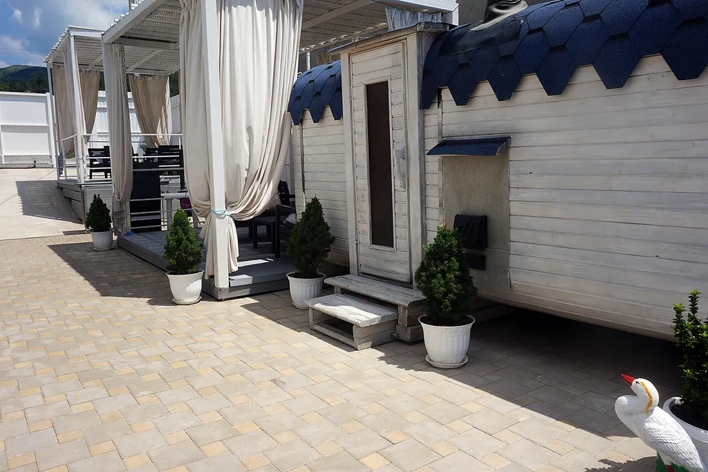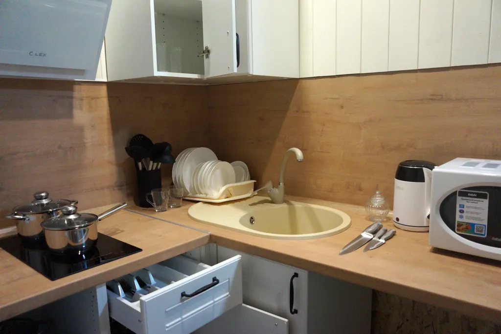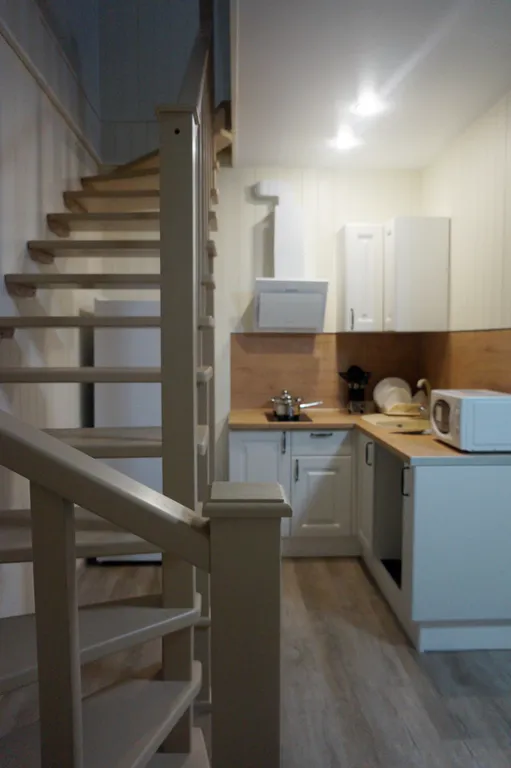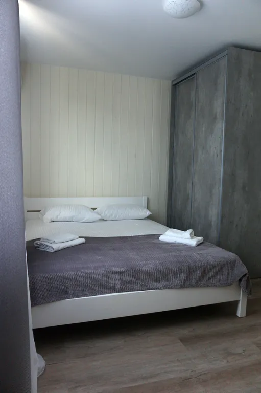 Домики в два этажа со всеми удобствами, кухней, верандой, стиральной машинкой, тv, wi-fi. На первом этаже домика кухня гостинная с двухспальным диваном. На втором этаже две спальни. В первой двуспальная кровать, во второй двуспальная и односпальная кровати. На территории 4 домика. Зона отдыха и бассейн для гостей четырёх домиков.