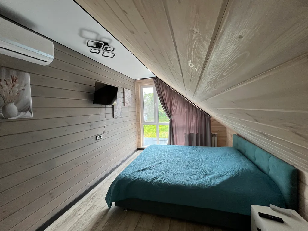 На первом этаже расположена кухня- гостиная 30м. Кв., санузел, душевая кабина, на втором две спальни.