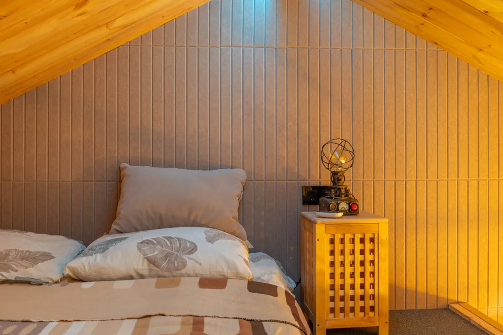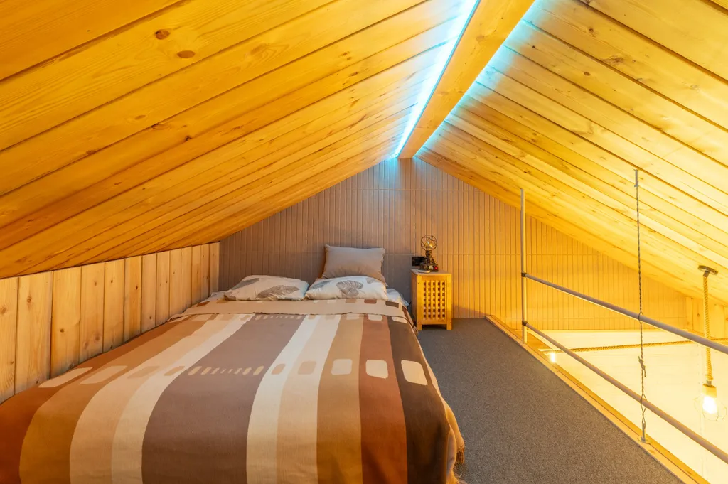 Комфортное размещение до 4 гостей: на лофт-этаже двуспальная кровать под сводами крыши — очень уютно и камерно.