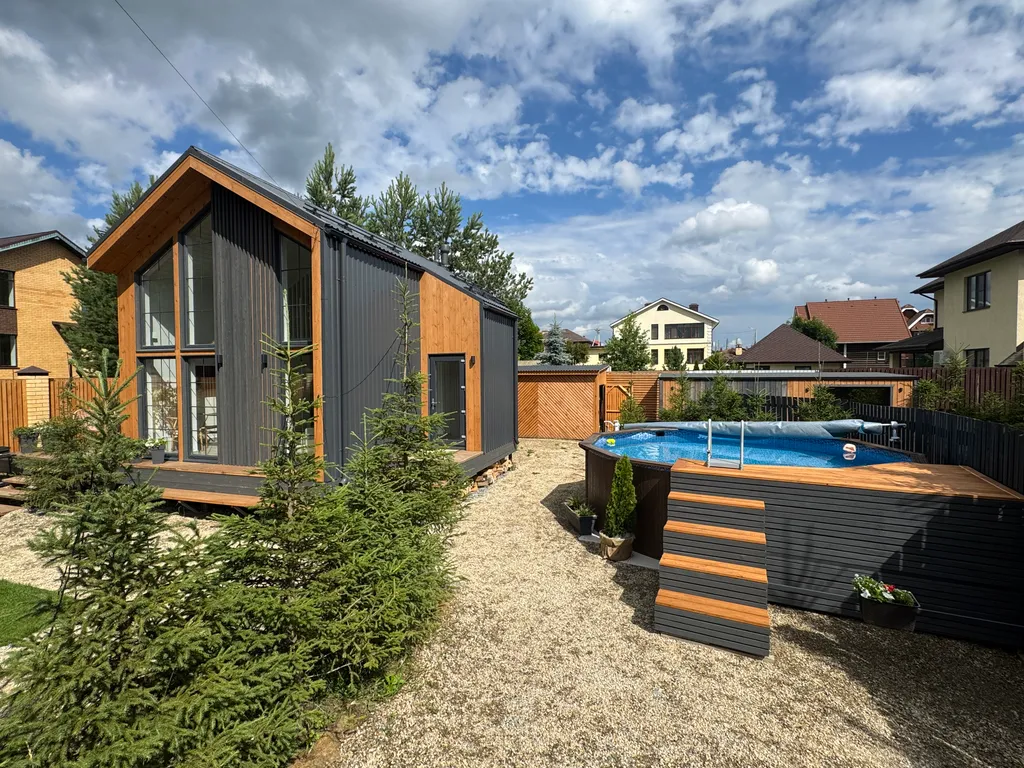Дом расположен вблизи пушистых сосен, рядом с озером.