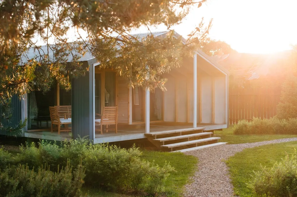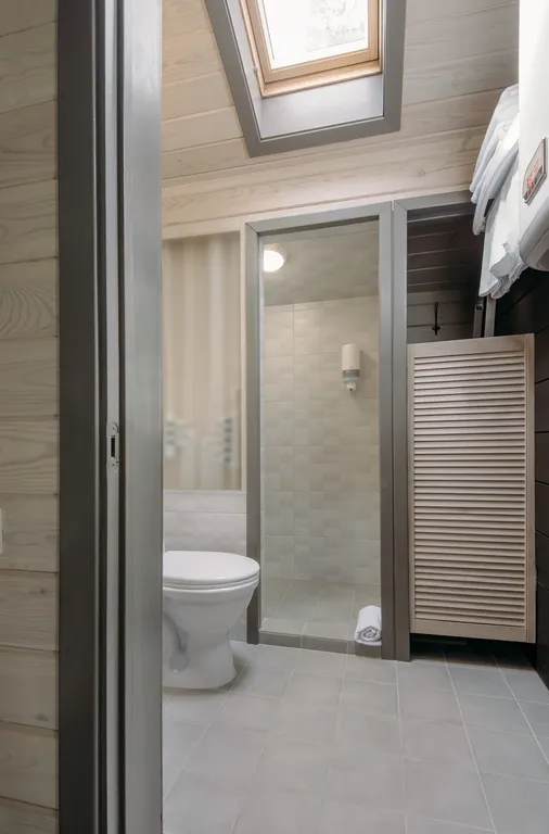 Дом оборудован санузлом с душевой кабиной, теплым полом и комплектом полотенец.