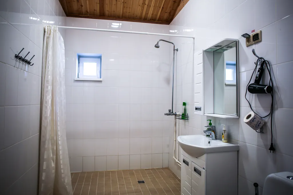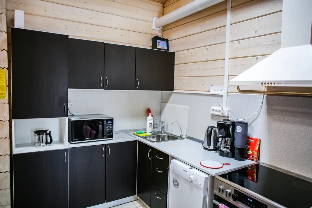 Каждый из гостевых домов оснащен уютной гостиной комнатой с диваном, большим обеденным столом, широкоэкранным телевизором имеющим выход в интернет, антенной на 20 TV общественных каналов, кухонным уголком, оборудованным бытовой техникой (плитой, холодильником, посудомоечной машиной, микроволновой печью, чайником, кофеваркой, кухонными принадлежностями, посудой), тремя совмещенными с душевой комнатой санузлами, стиральной машиной. Дома оборудованы системой теплый пол по всему дому, сервисной комнатой для хранения и подготовки спортивного инвентаря, сушками (сушильными шкафами), доступом в интернет (Wi-Fi бесплатно), парковкой на территории (бесплатно). Для проживающих гостей имеется беседка и мангал.