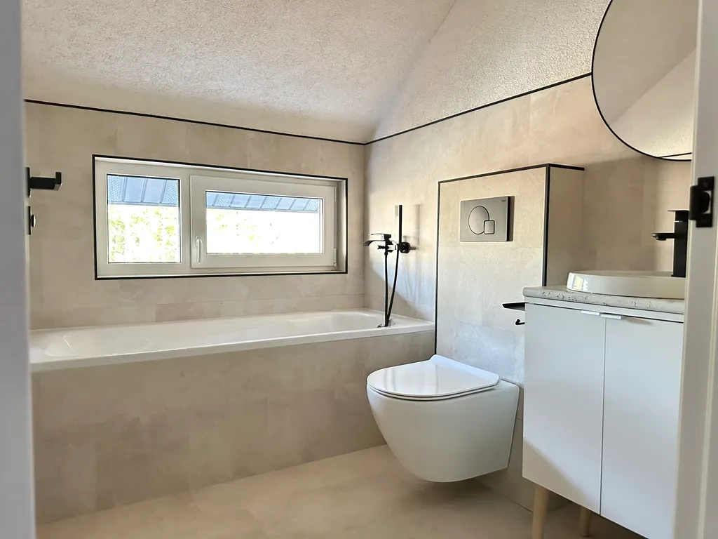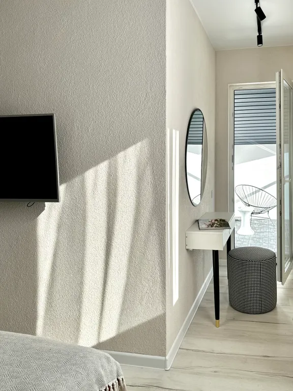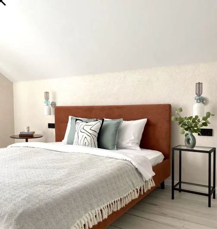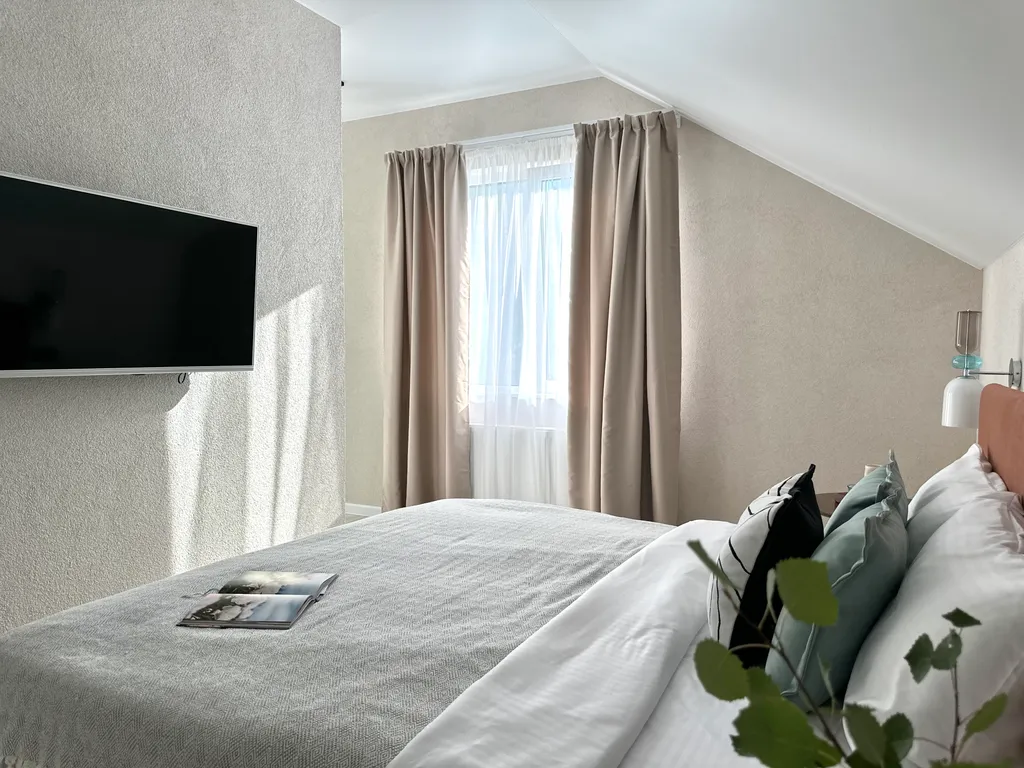 - Мастер-спальня со своим санузлом с ванной и балконом, есть телевизор.