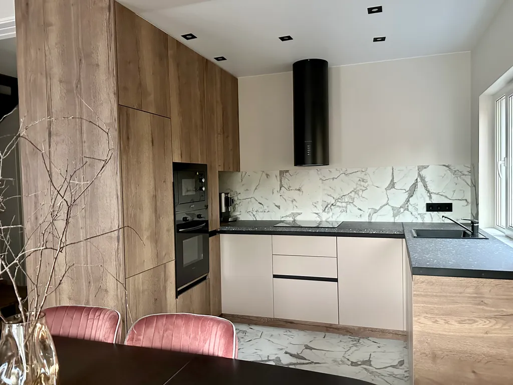 - Кухня-гостиная: большой диван, телевизор, Wi-Fi. На кухне имеется вся необходимая посуда и столовые приборы, посудомоечная машина, варочная панель, духовой шкаф, встроенный холодильник, автоматическая кофемашина зерновая, микроволновка, большой стол на 2. 30.